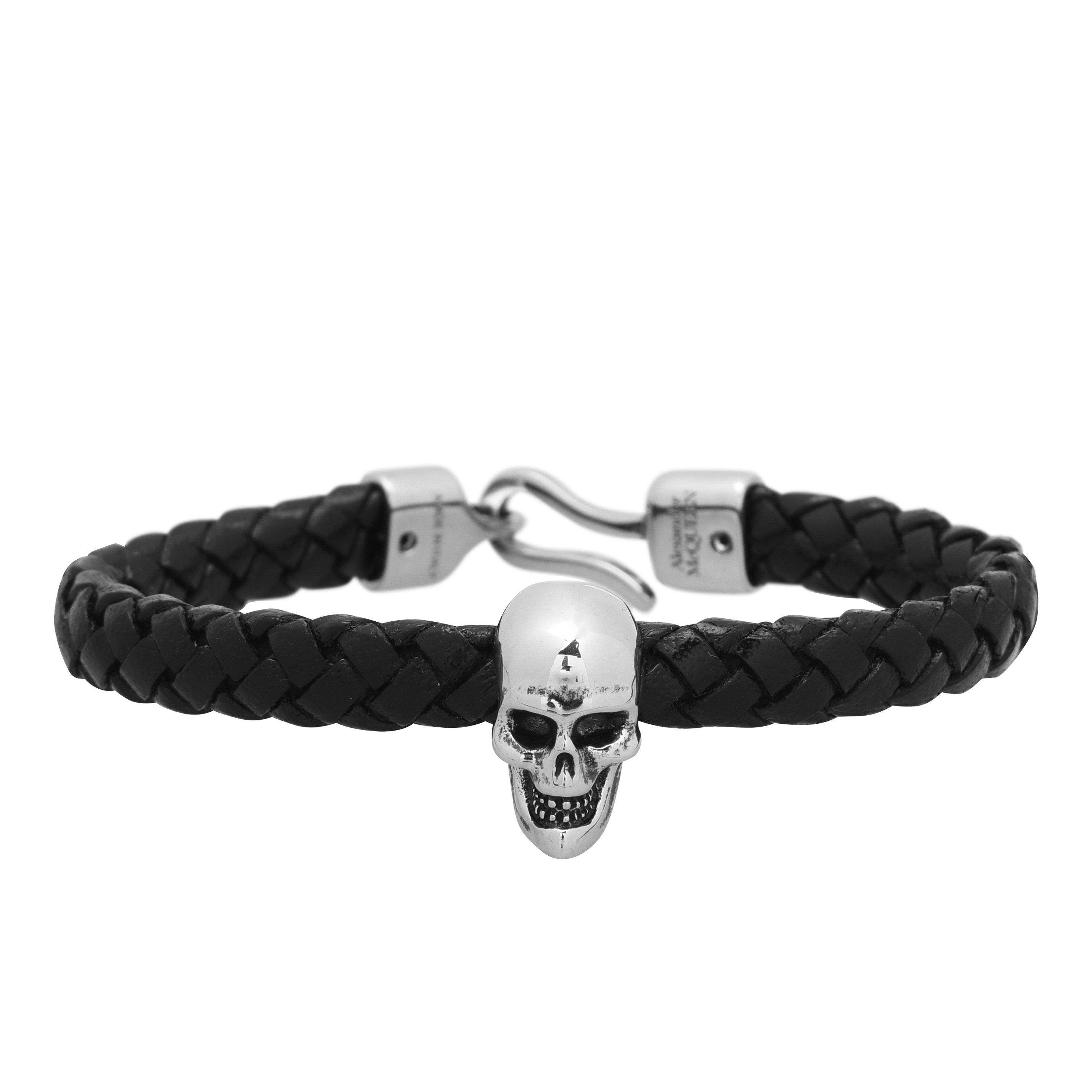 Complete your ensemble with the skull leather bracelet from Alexander McQueen. Crafted from a smooth woven leather, this piece then comes featuring a brass hook closure and is finished with the brand's iconic skull charm threaded through the bracelet strap. This piece would make a welcome addition to your bold wrist collection. Don't miss this.