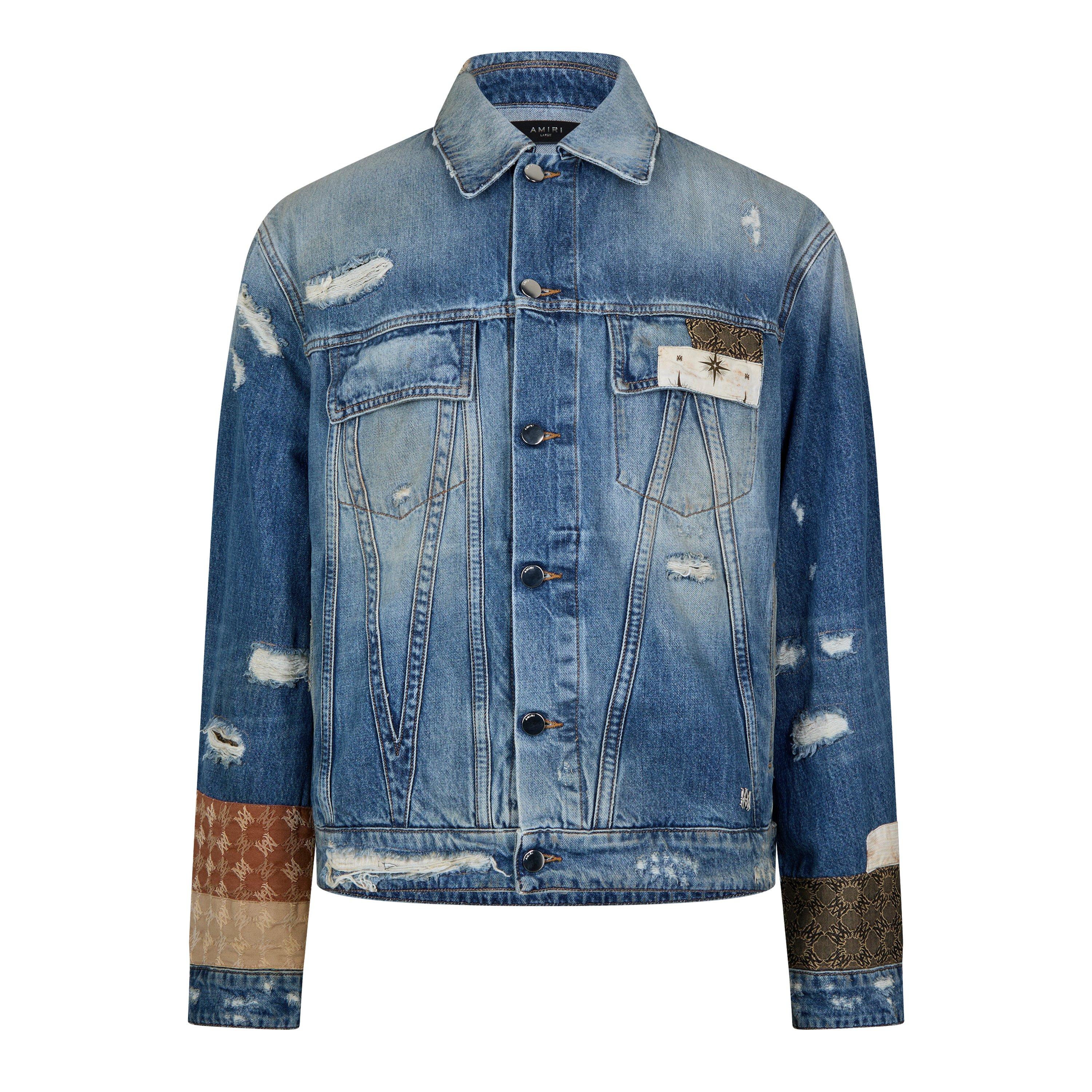 Channel edge style with this Amiri Airpatch Trucker Distressed Denim Jacket designed for the modern man. Featuring intentional distressing and bandana patchwork, the regular-fit design includes functional patch pockets and a classic button-up placket for authentic trucker styling for casual everyday wear.