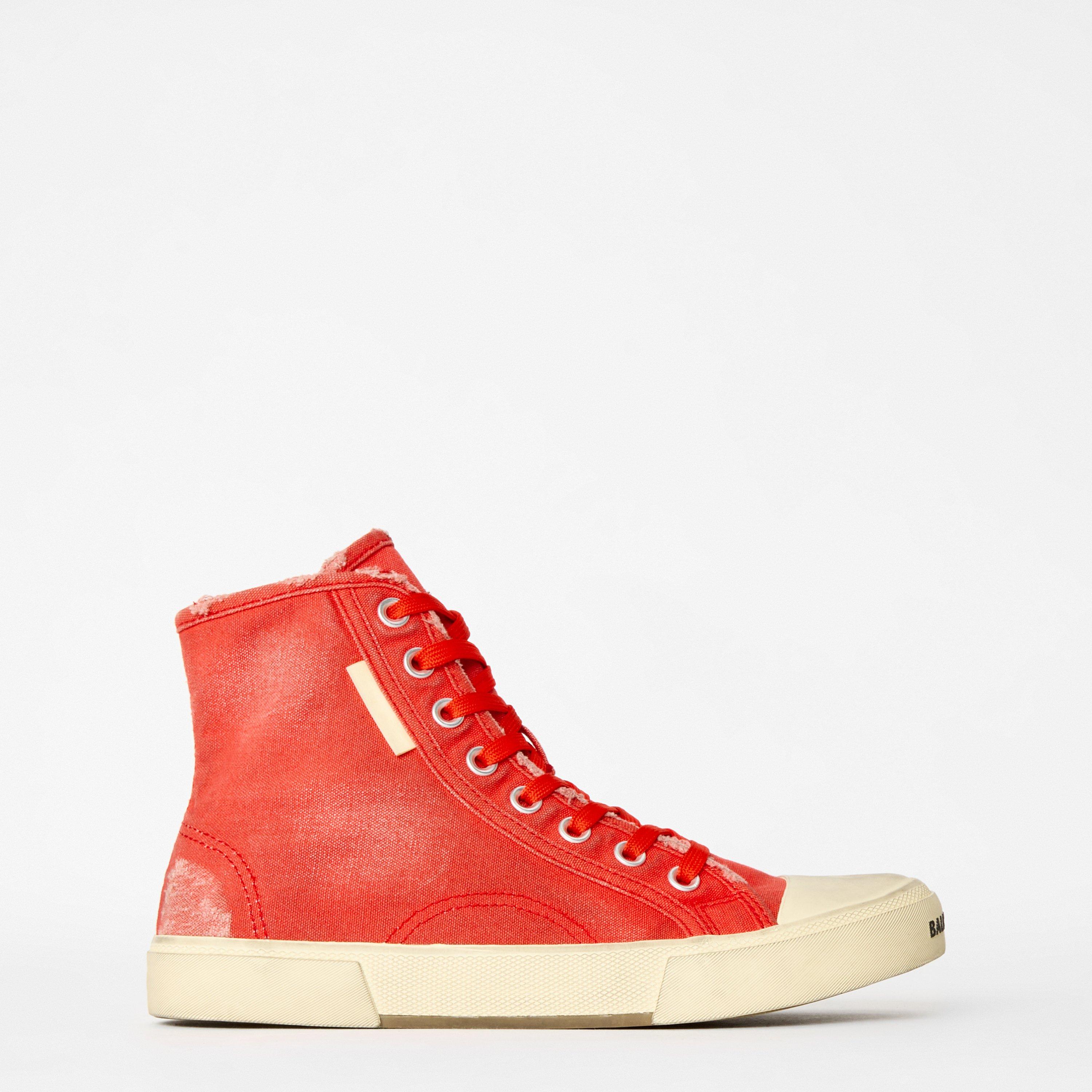 Crafted with a cotton canvas upper, these Paris High Tops exude an edgy design. The ankle-length design, with a front lace-up closure, ensures a secure and comfortable fit adding a touch of modernity to the classic silhouette. The rubber sole and toe bed provide excellent traction and durability and enhance the overall aesthetic with their sleek design. Balenciaga's meticulous attention to detail is evident in the vintage effect of the worn sole and frayed edges, lending an air of authenticity and uniqueness to each pair.