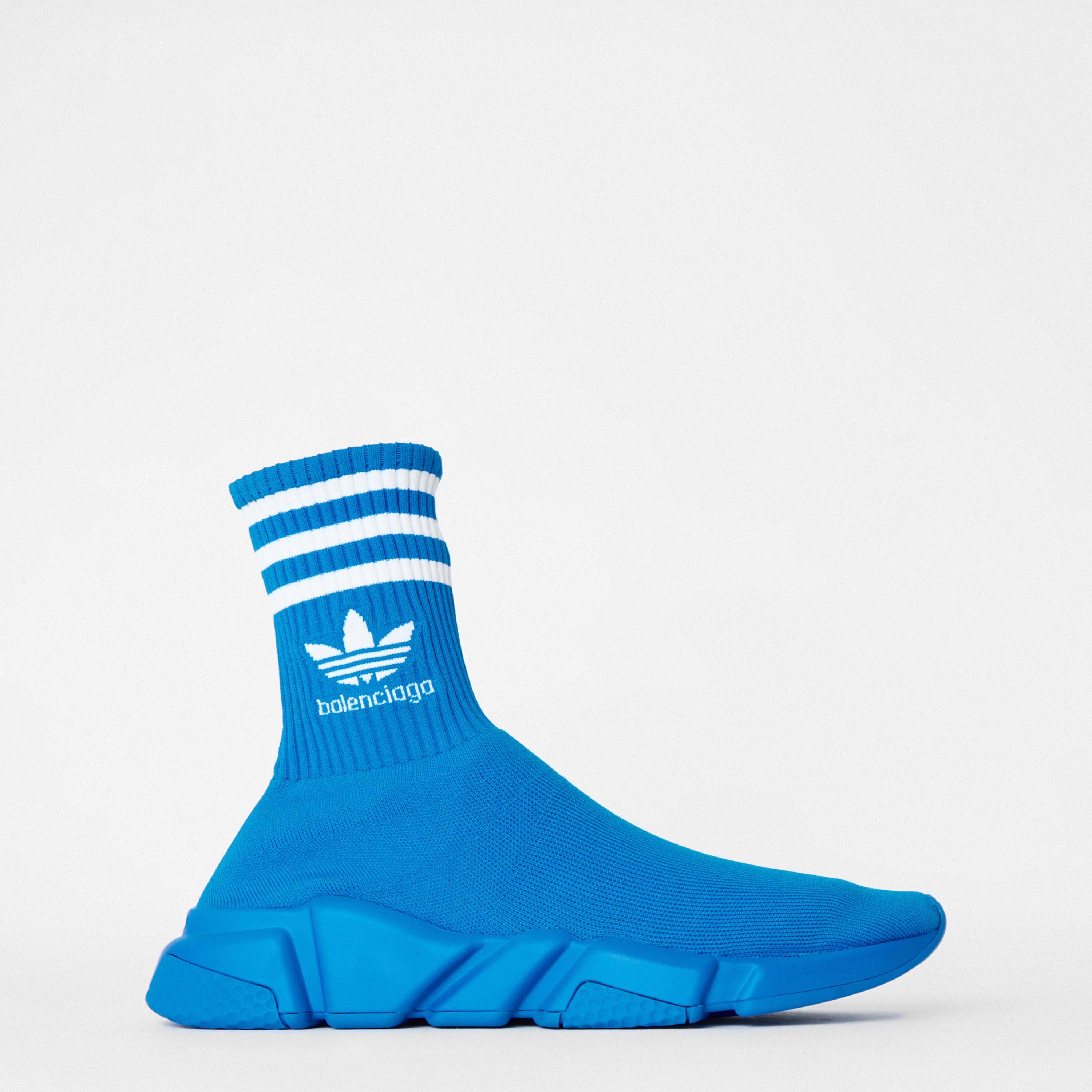 Sporting excellence meets luxe sophistication with the Balenciaga x adidas Speed Trainers. Crafted in a technical 3D knit sits atop a classic molded sole: this pair blurs the line between shoe and sock and provide an almost barefoot feel in an almond-toe design. Elevating the look are the classic retro adidas motifs: the triple stripe to the ankle collar and the trefoil to the sides; the Balenciaga logo beneath the trefoil signs off the design, a perfect synergy between two cutting-edge brands. Material: 85% polyester, 15% elastane.