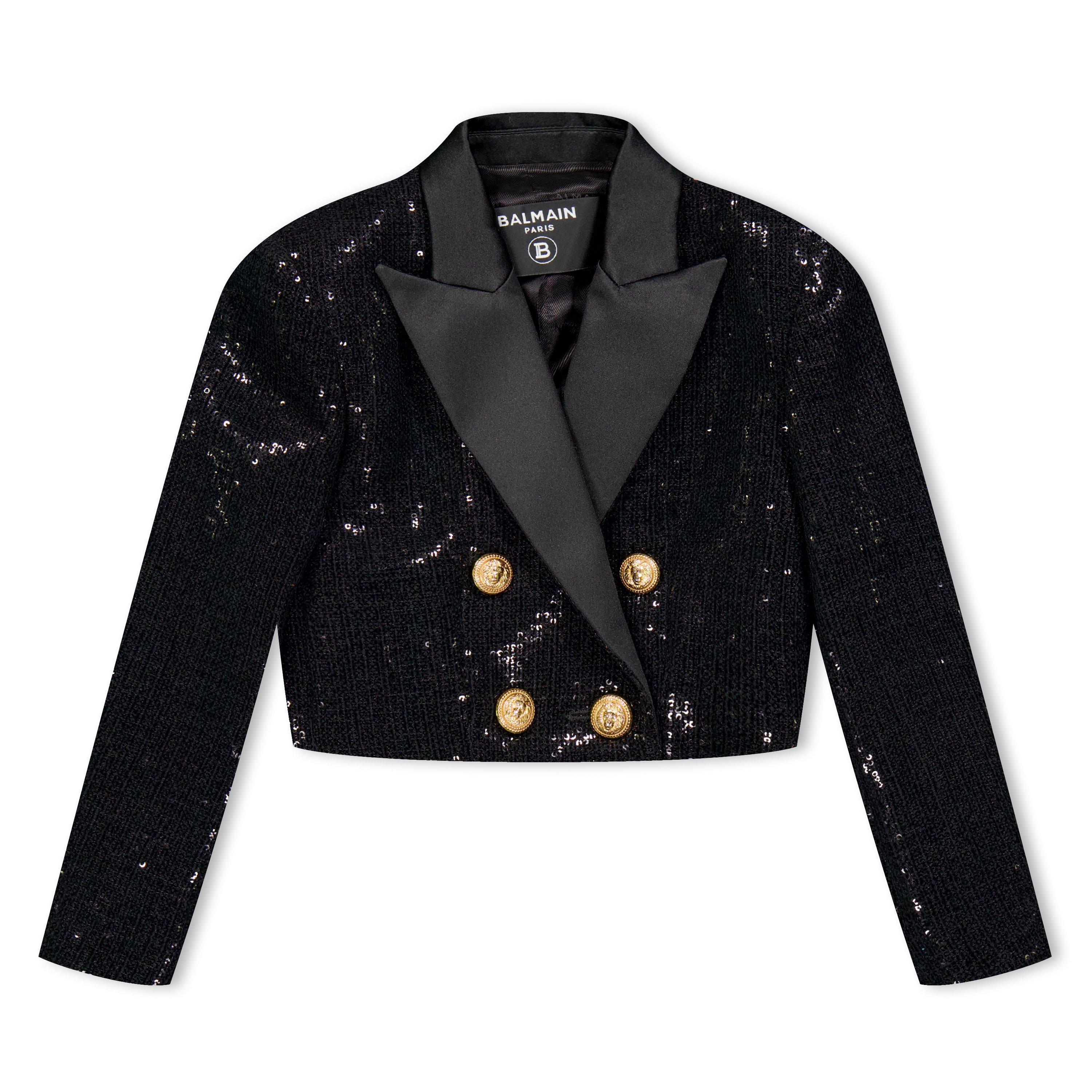 Balmain's Kids' Cropped Sequin Quilted Jacket delivers high-end children's fashion. This eye-catching piece features shimmering textural elements with detailed quilting, creating a standout look that maintains the brand's classic aesthetic while adapting it for younger fashion enthusiasts.