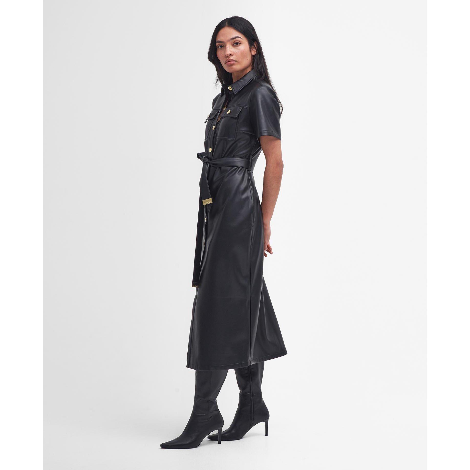 This season, Barbour International's high-attitude motorcycling heritage fuels it's newest arrivals; take the B.Intl Aria Midi Dress, for example. Crafted from a supple faux-leather, this striking silhouette takes inspiration from soft utility trends with its patch pockets to the chest and bright brass hardware to the buttons. Simply finish this look by cinching in the waistline with the self tie belt for an empowering look.