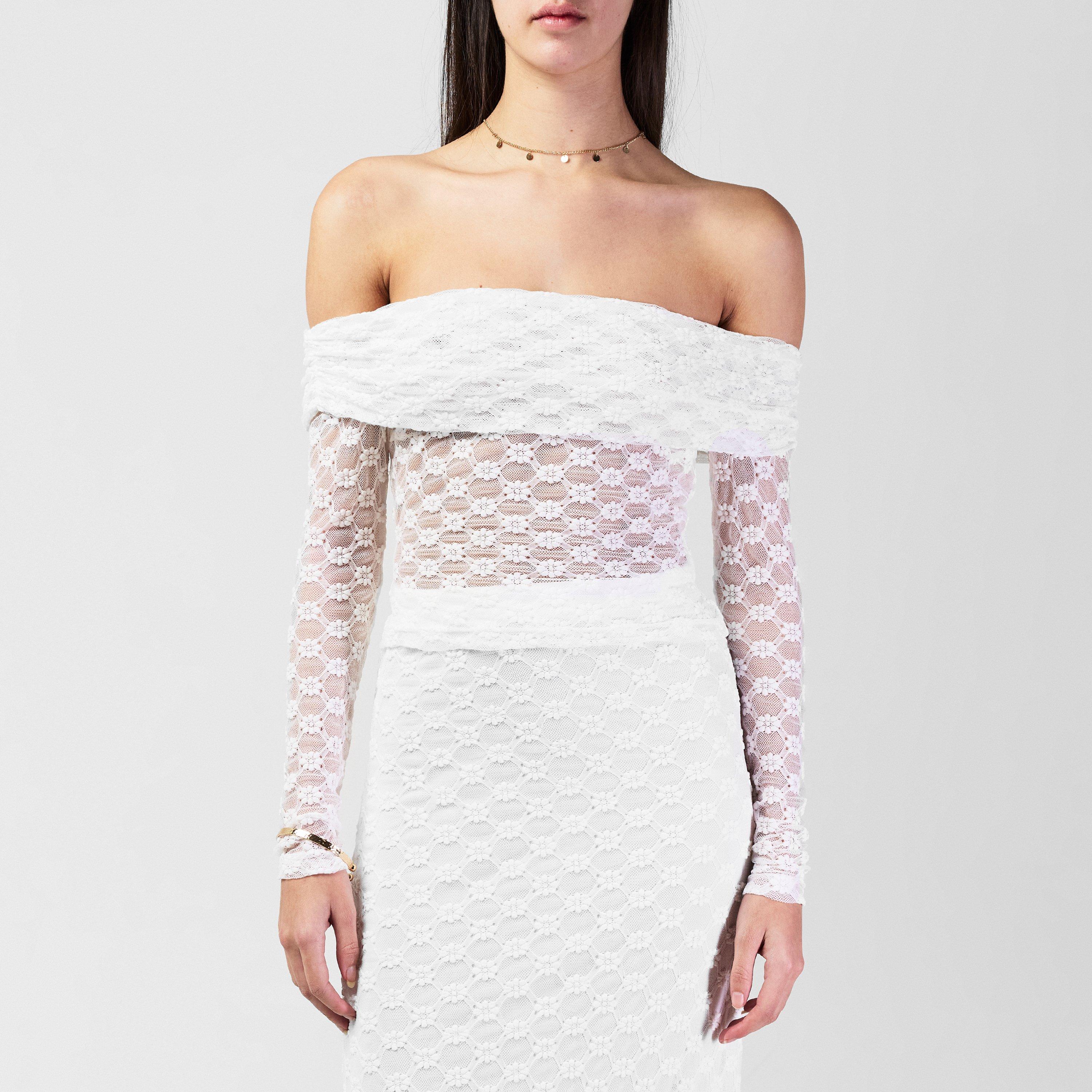 The Adoni Off The Shoulder Top is designed for a form fit with long sleeves, high hip length and lace detailing.