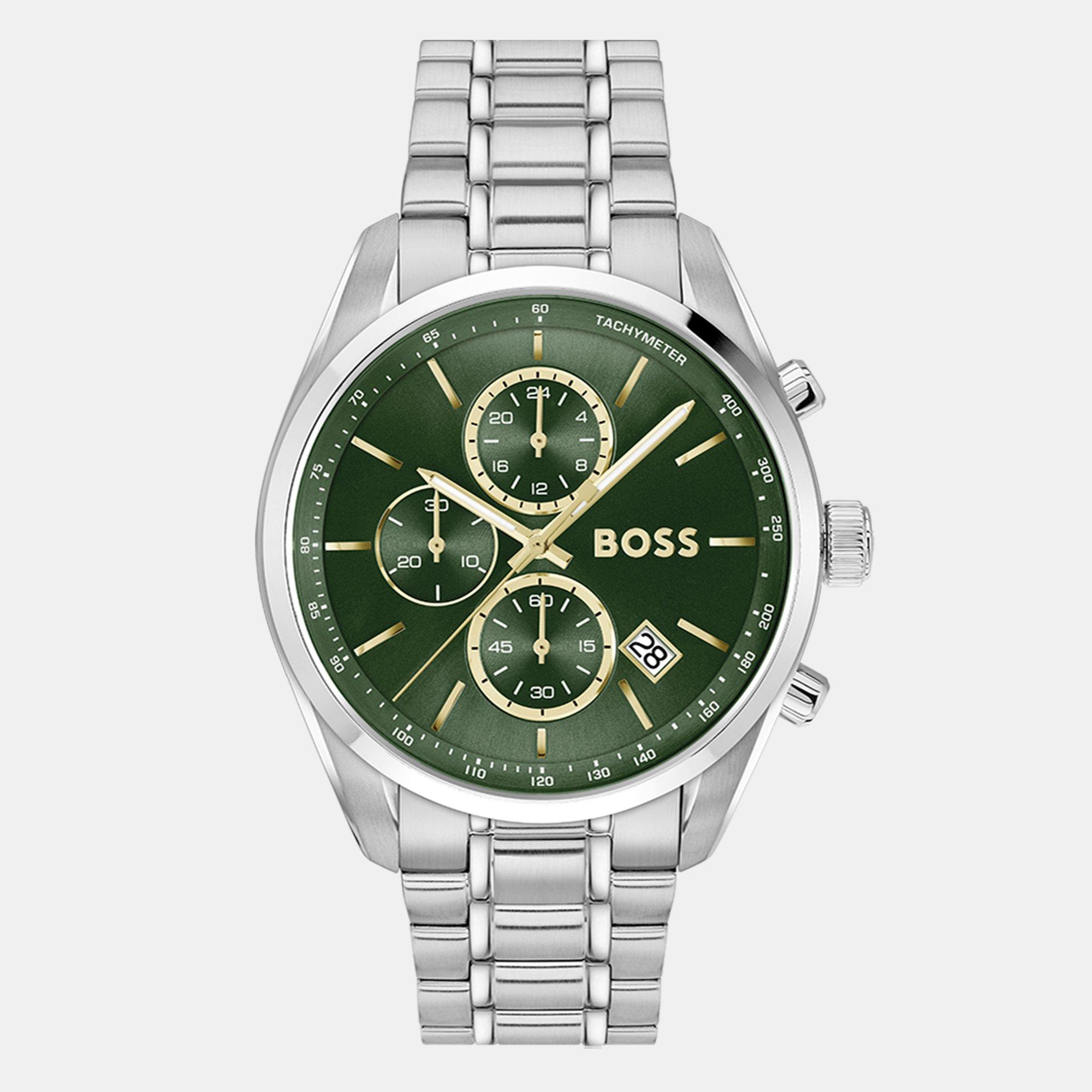 Gents BOSS Chronograph from the Grand Prix family. Featuring a 44.5mm stainless steel case, green dial with date window, stainless steel bracelet. Water resistant to 5ATM.