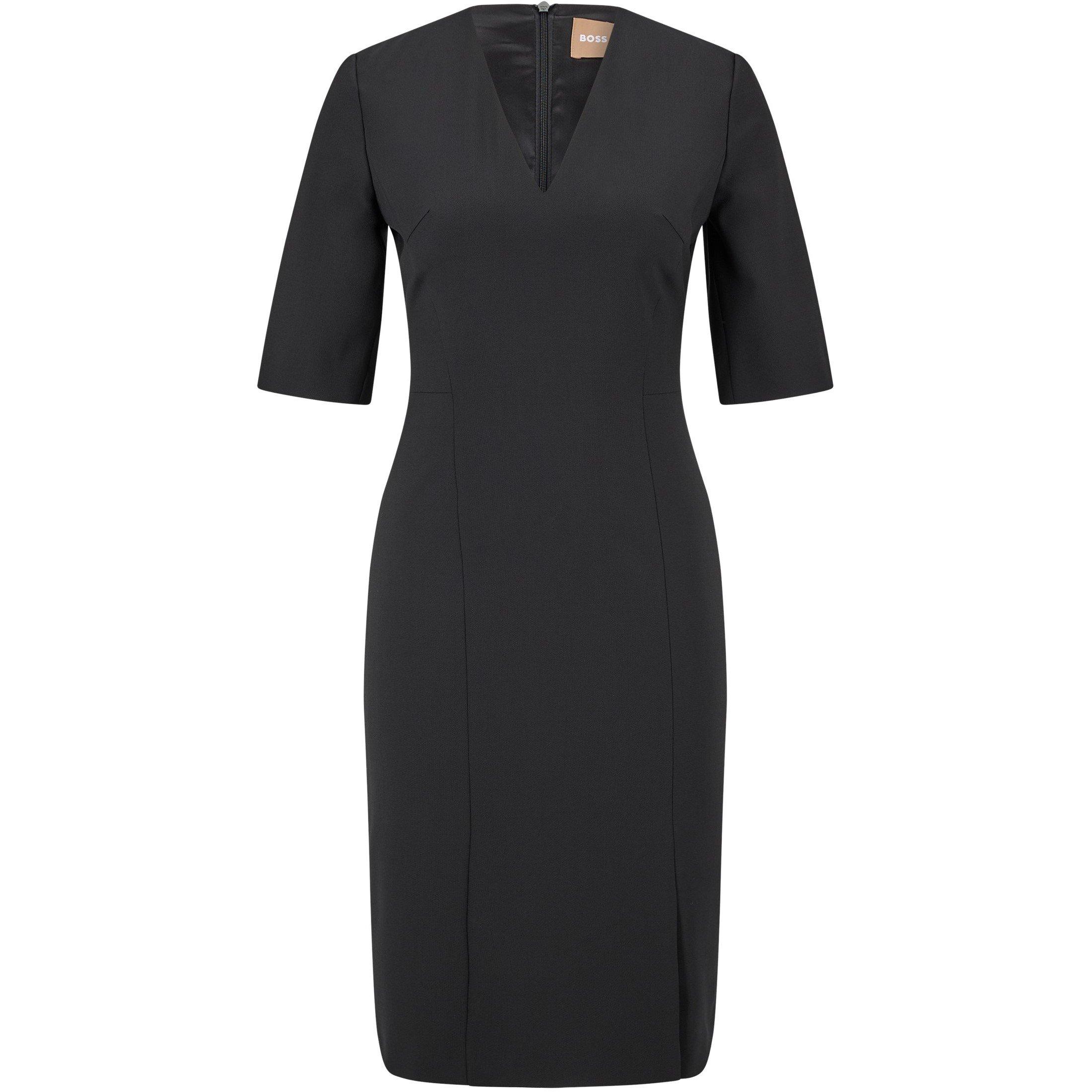The BOSS Daleno wrap dress features a striking shape with many styling options. The wrap design creates a profile with clean lines and precise draping, transitioning between professional and evening occasions.