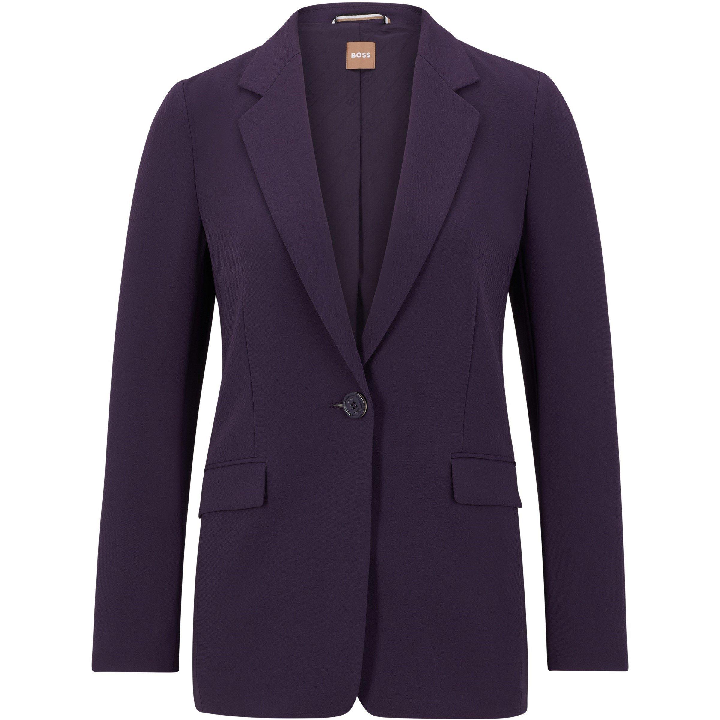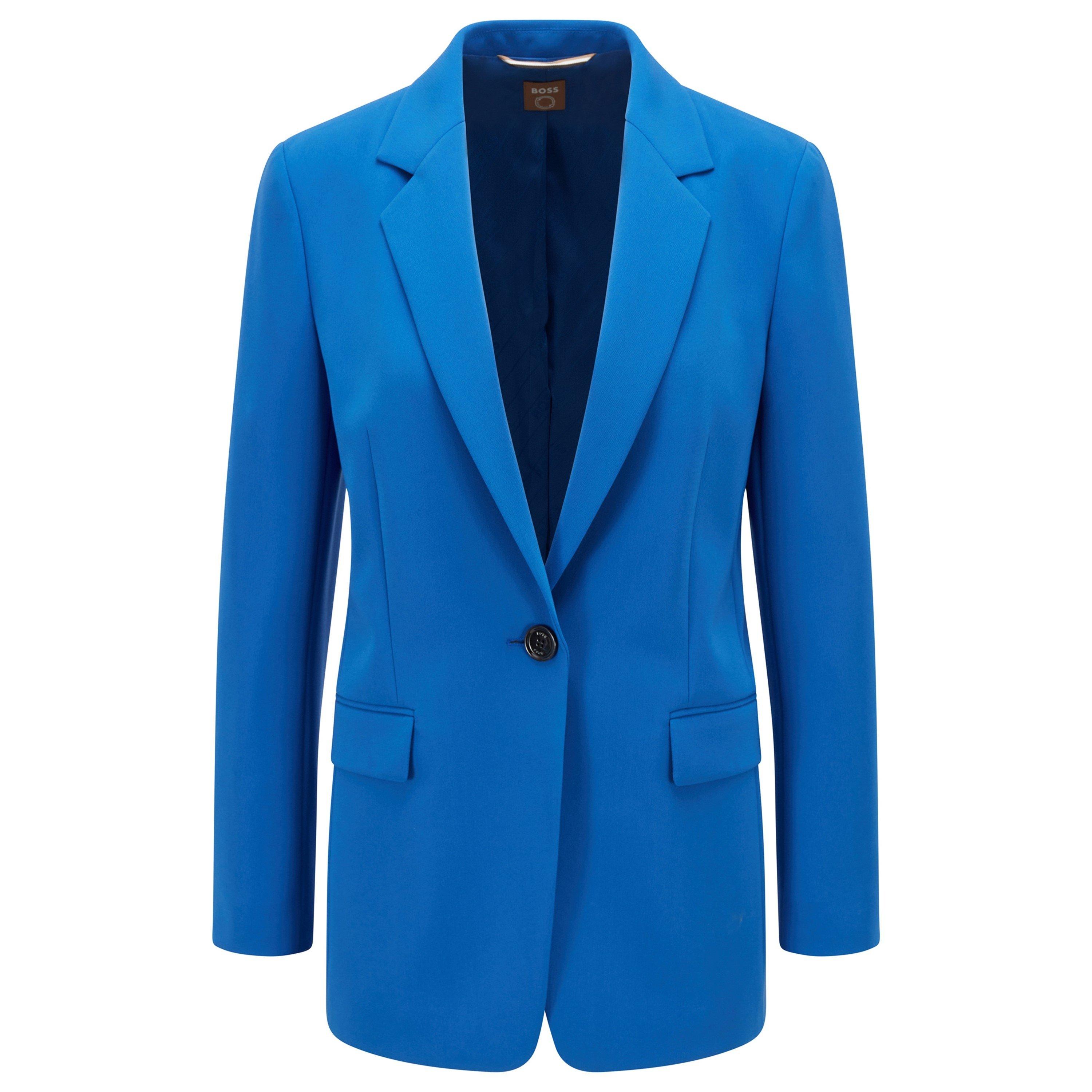 The BOSS Jocalua8 Tailored Blazer features structured shoulders and clean lines. This business blazer offers professional style ideal for office environments with its defined shape and precise cut, creating a notable look through its subtle textured fabric that maintains its form throughout wear. Product Highlights