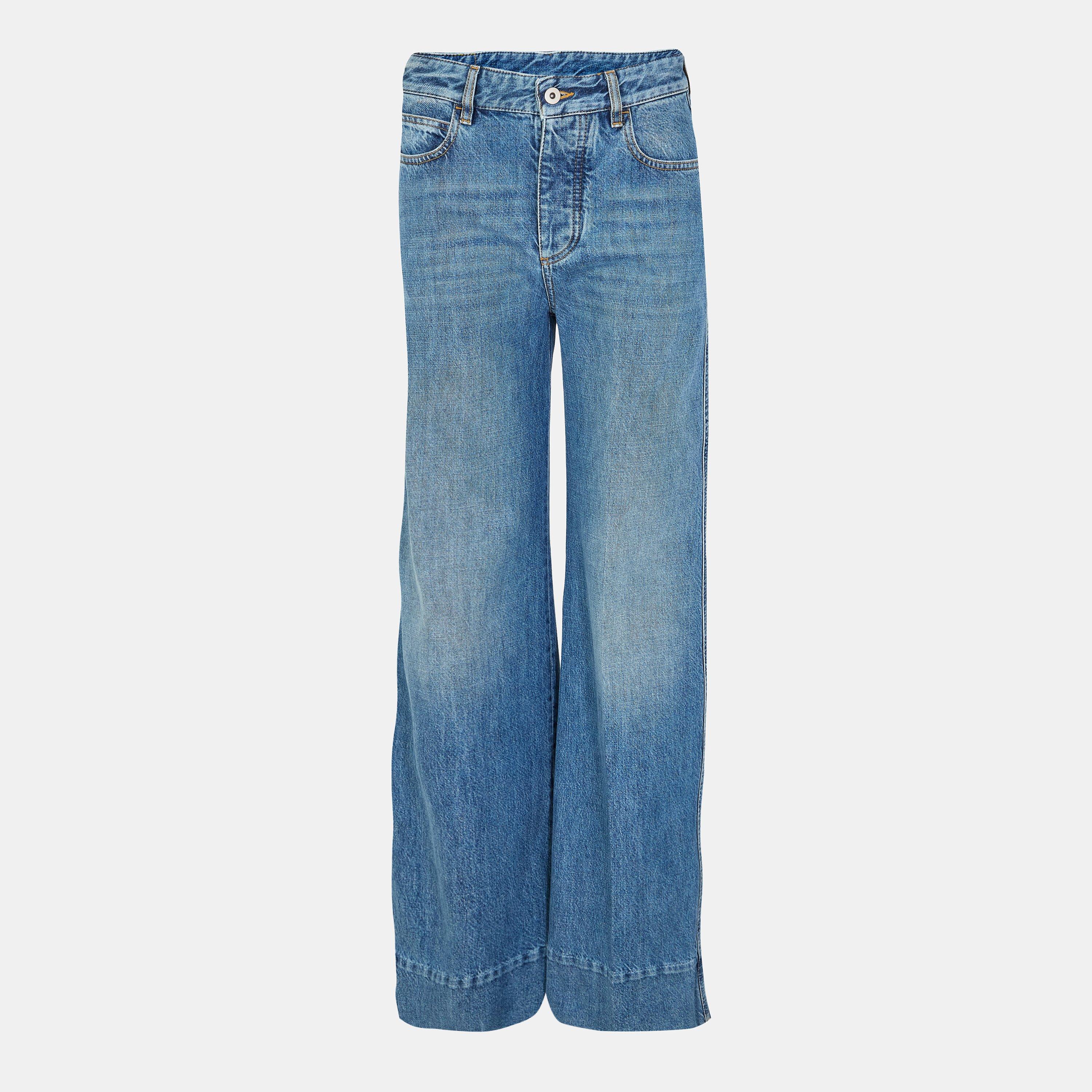Treated with a vintage indigo wash, these women's wide leg jeans have a distinct and worn-in appearance. Adorned with the prestigious Bottega Veneta leather patch on the rear for instant brand recognition, these trousers are ideal for casual and semi-formal occasions. Whether meeting friends for drinks or going out for a meal, Bottega Veneta's Vintage Indigo Wide Leg Denim will effortlessly elevate your ensemble.