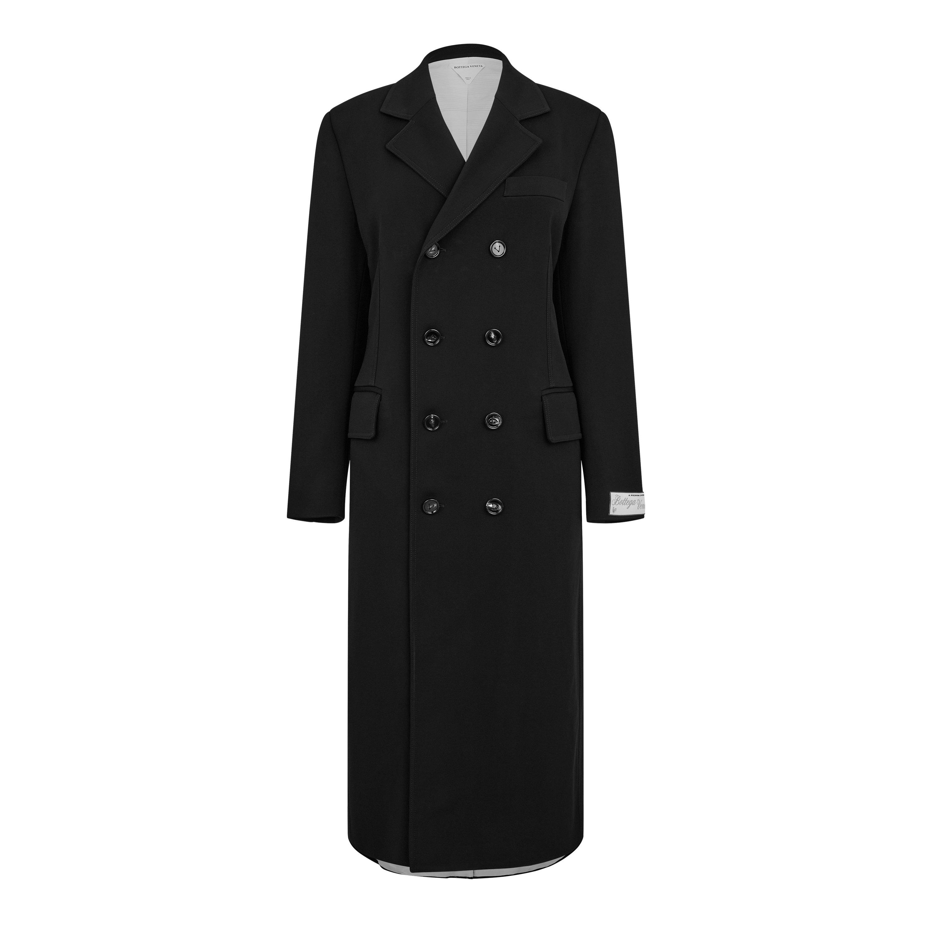The Matt Fluid Jersey Coat from Bottega Veneta features a sleek double-breasted design. This mid-length outerwear piece offers a flattering shape with lapel collar styling and secure fastenings.