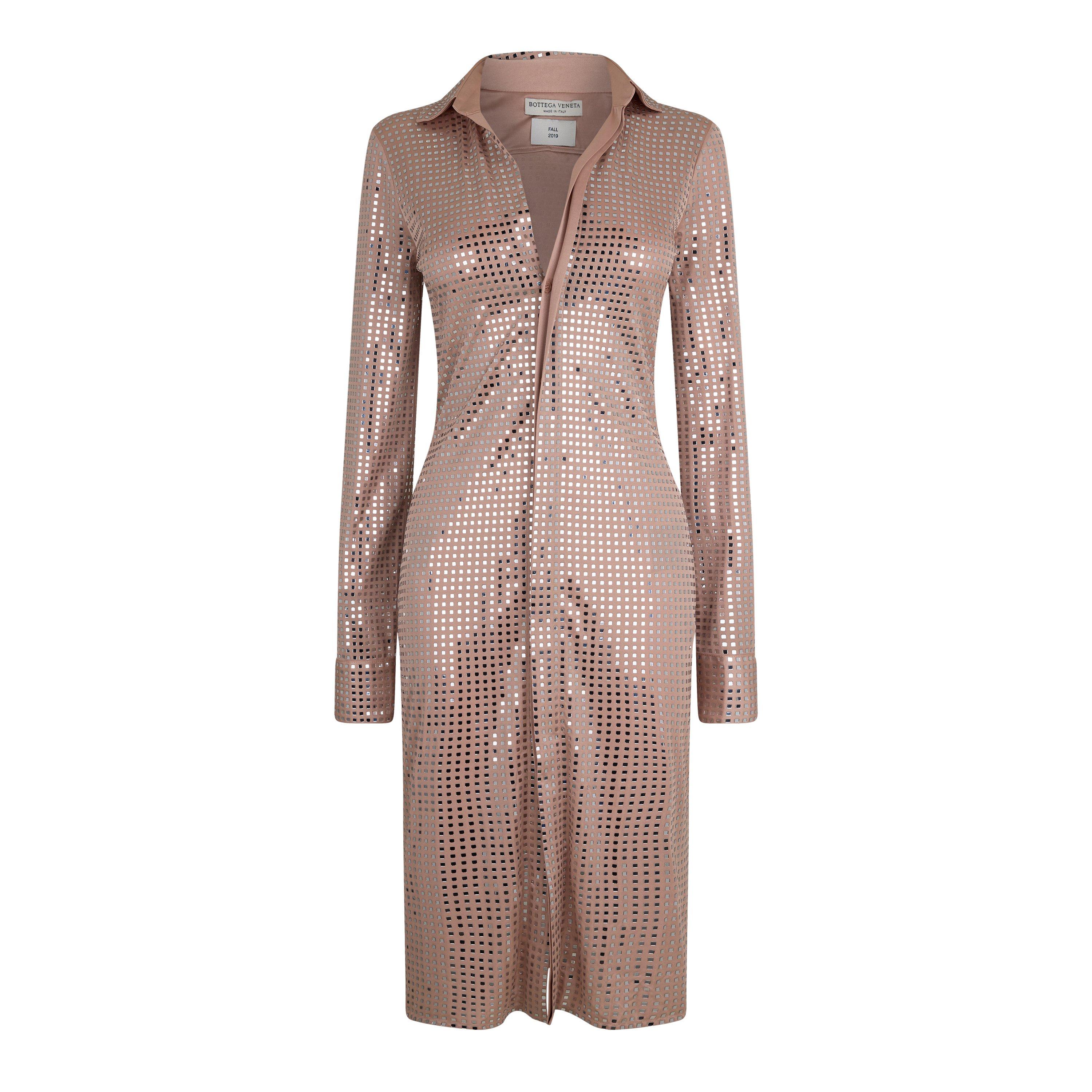 The Bottega Veneta Structured Shirt Dress features clean lines and a streamlined profile. The design supports flexible wear across different occasions.
