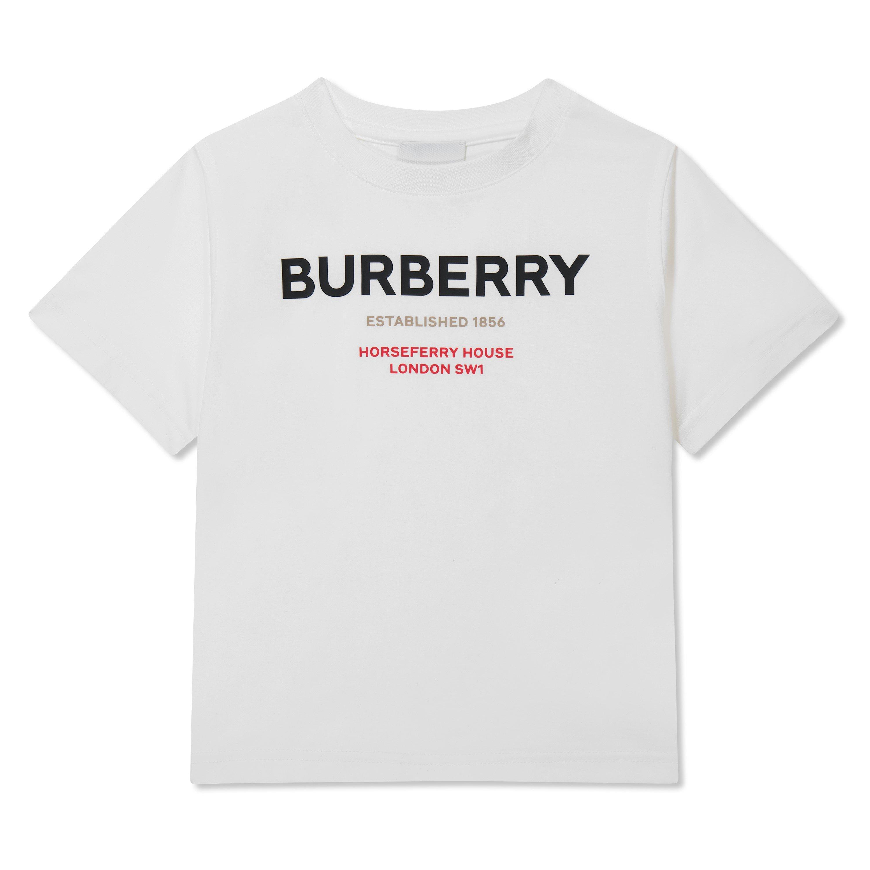 Revitalise your little one's essentials with this Children's Cedar T Shirt from Burberry. Constructed from sustainable organic cotton, this t shirt is cut in a regular fit and features a ribbed crew neckline with short sleeves, a straight hemline and elasticated trims for a classic style. The design is elevated with the Burberry logo printed on the front for immediate brand recognition. Fabric: 100% organic cotton. Knit Trim: 97% cotton, 3% elastane. Machine washable at 30 degrees.