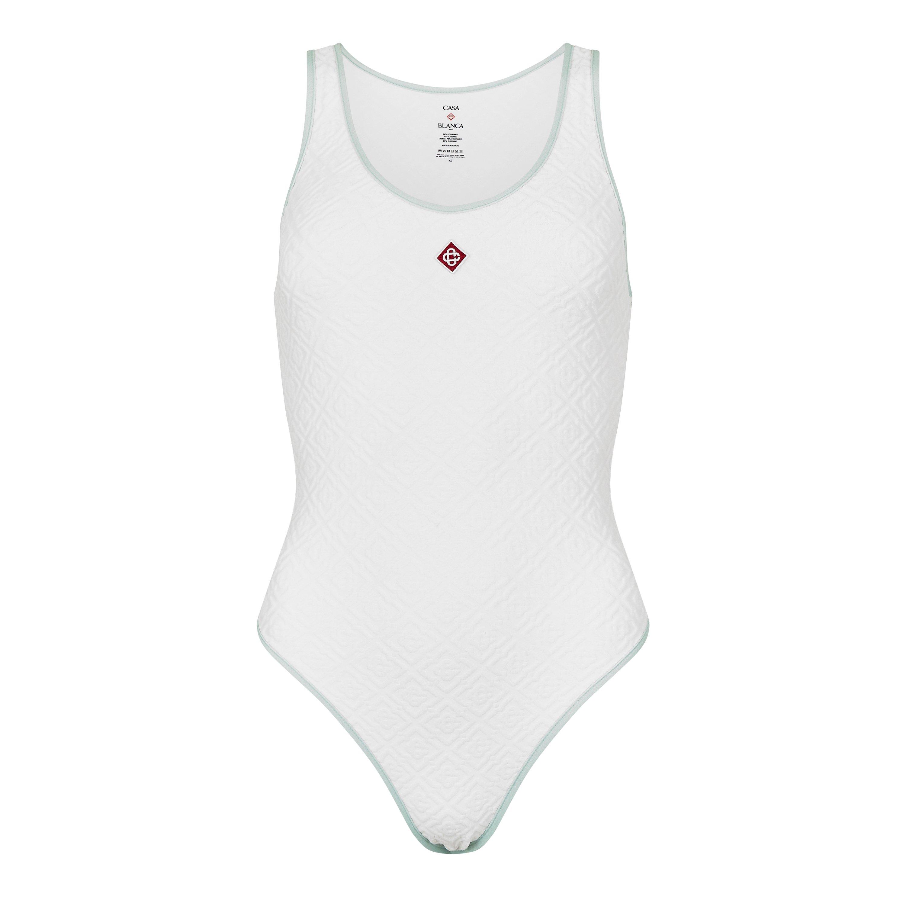 Get holiday-ready with Casablanca's Jacquard Monogram Swimsuit. With embroidered detailing on the chest and contrasting trims, this is a stylish addition to your collection. Whether poolside with a cocktail or taking a dip in warm ocean waters, this women's designer one-piece is a suitcase necessity.