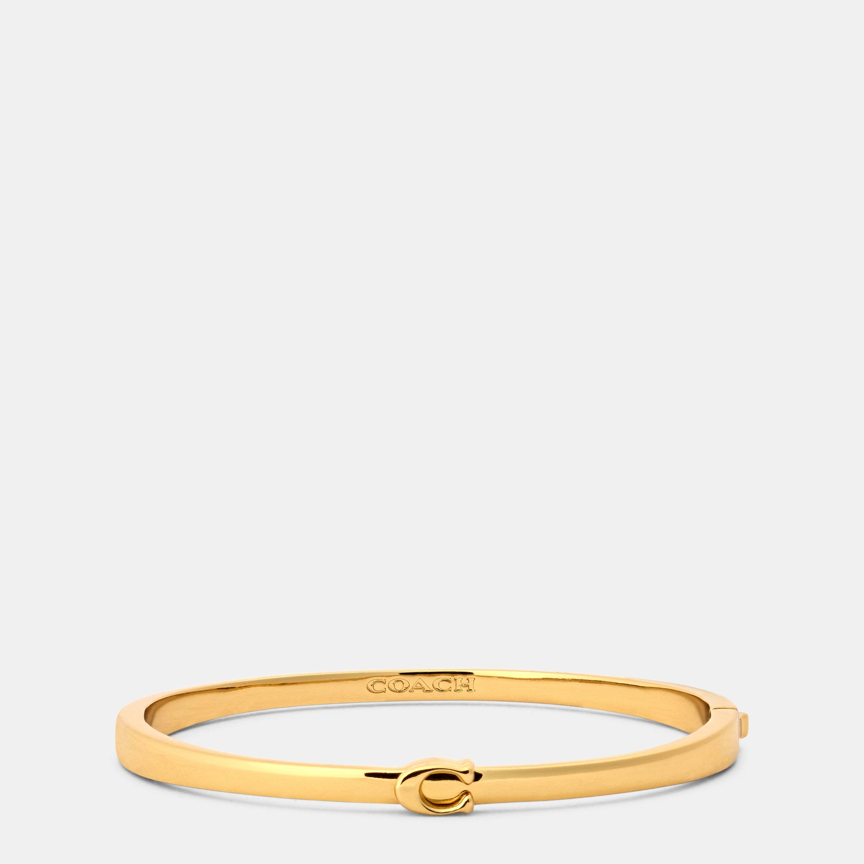 Coach's Hinge Bangles offer sleek style with a precise design. The hinged mechanism provides easy wear while maintaining the brand's characteristic look.
