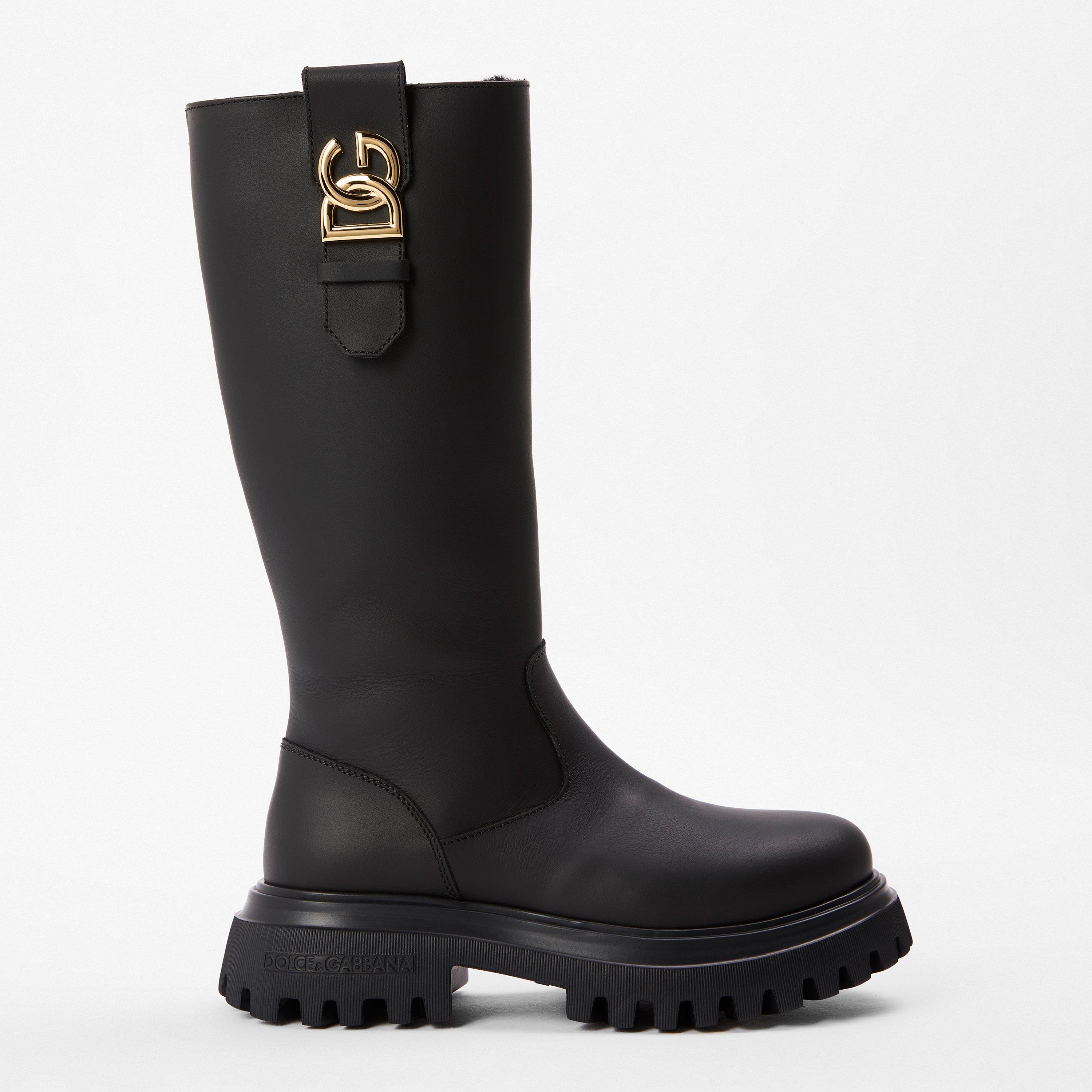 Dolce & Gabbana Kids' Knee High Boots bring Italian styling to children's footwear. These sleek, tall boots feature a fashionable knee-length shape with secure fastenings, offering runway-inspired design and practical comfort for young fashion enthusiasts.