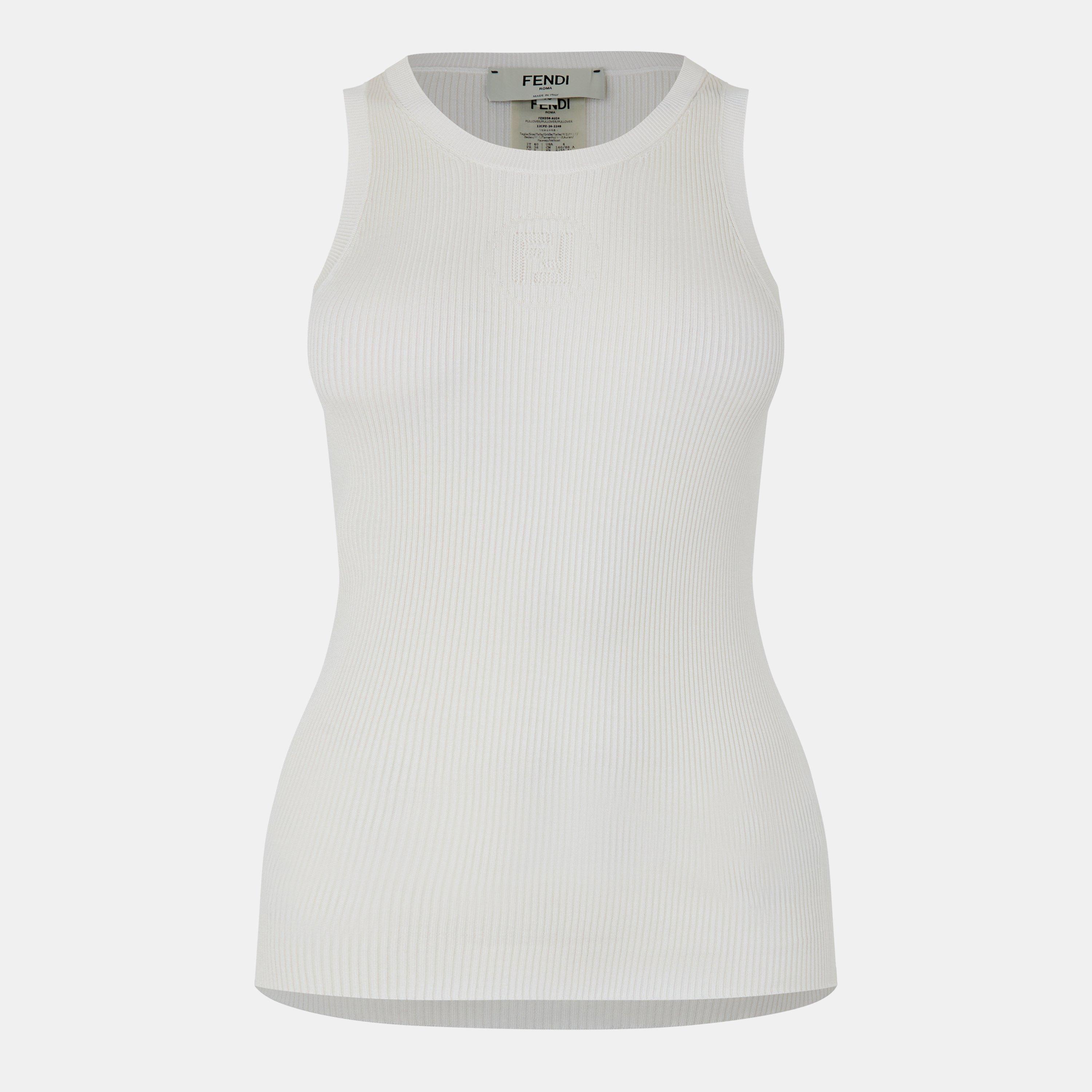 The Fendi Women's Knitted Tank Vest features a fine-gauge knit with clean, structured lines that define its sleeveless shape. The tank's proportions showcase Fendi's quality, offering a streamlined fit with a classic crew-neck neckline.