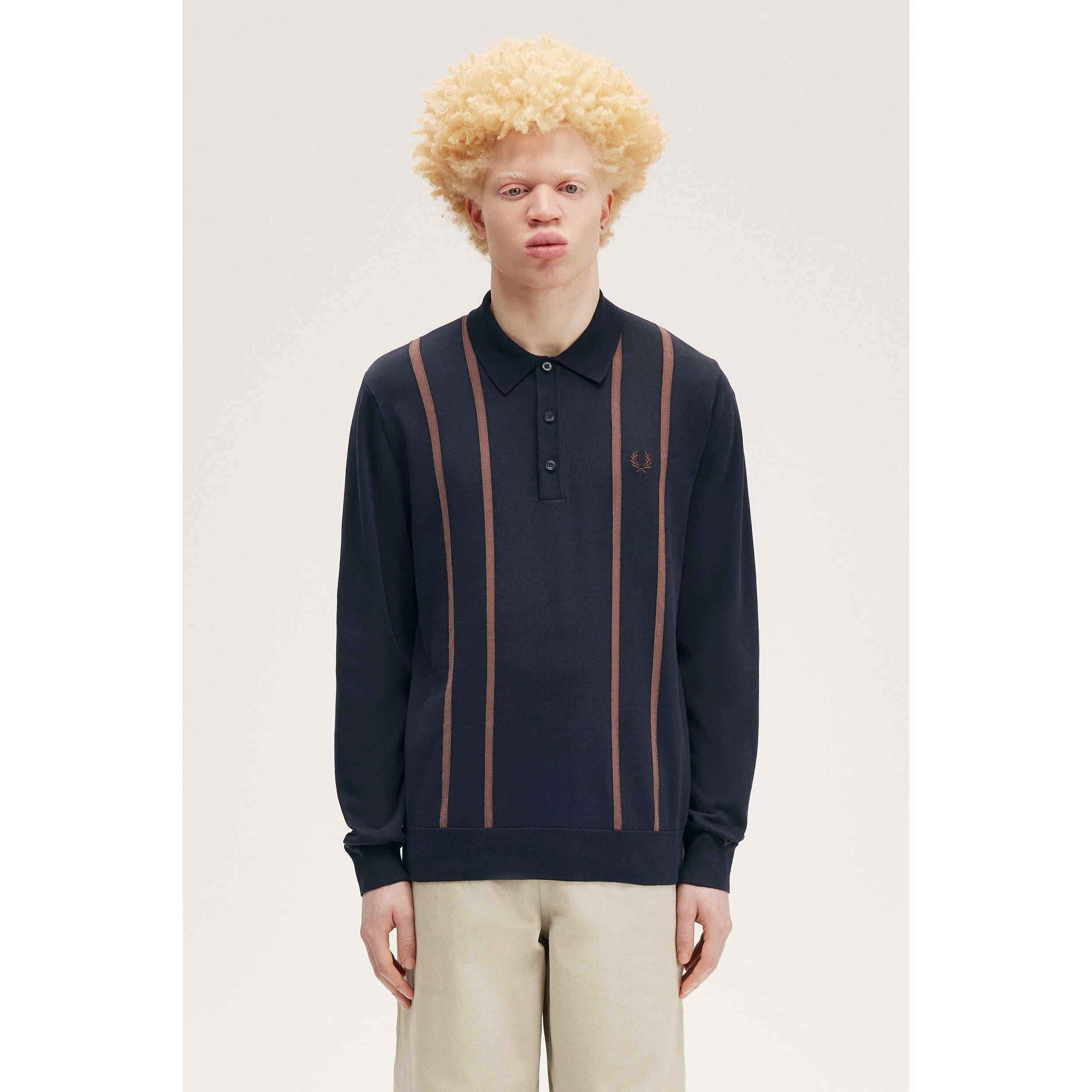Knitwear meets classic sportswear in the Fred Perry Stripe Knitted Long-Sleeve Polo Shirt, featuring structured collar detailing and retro stripe patterning that defines modern fashion.