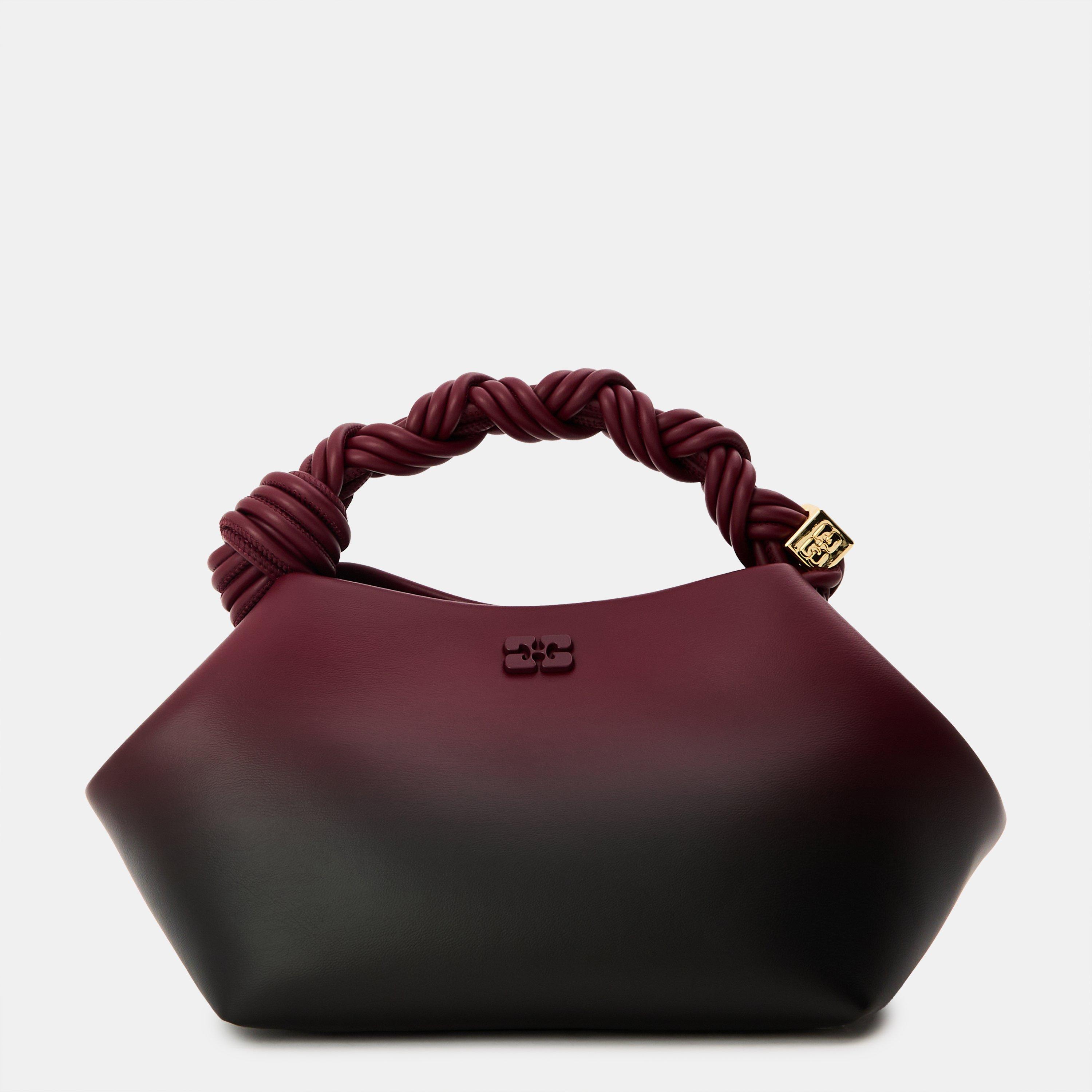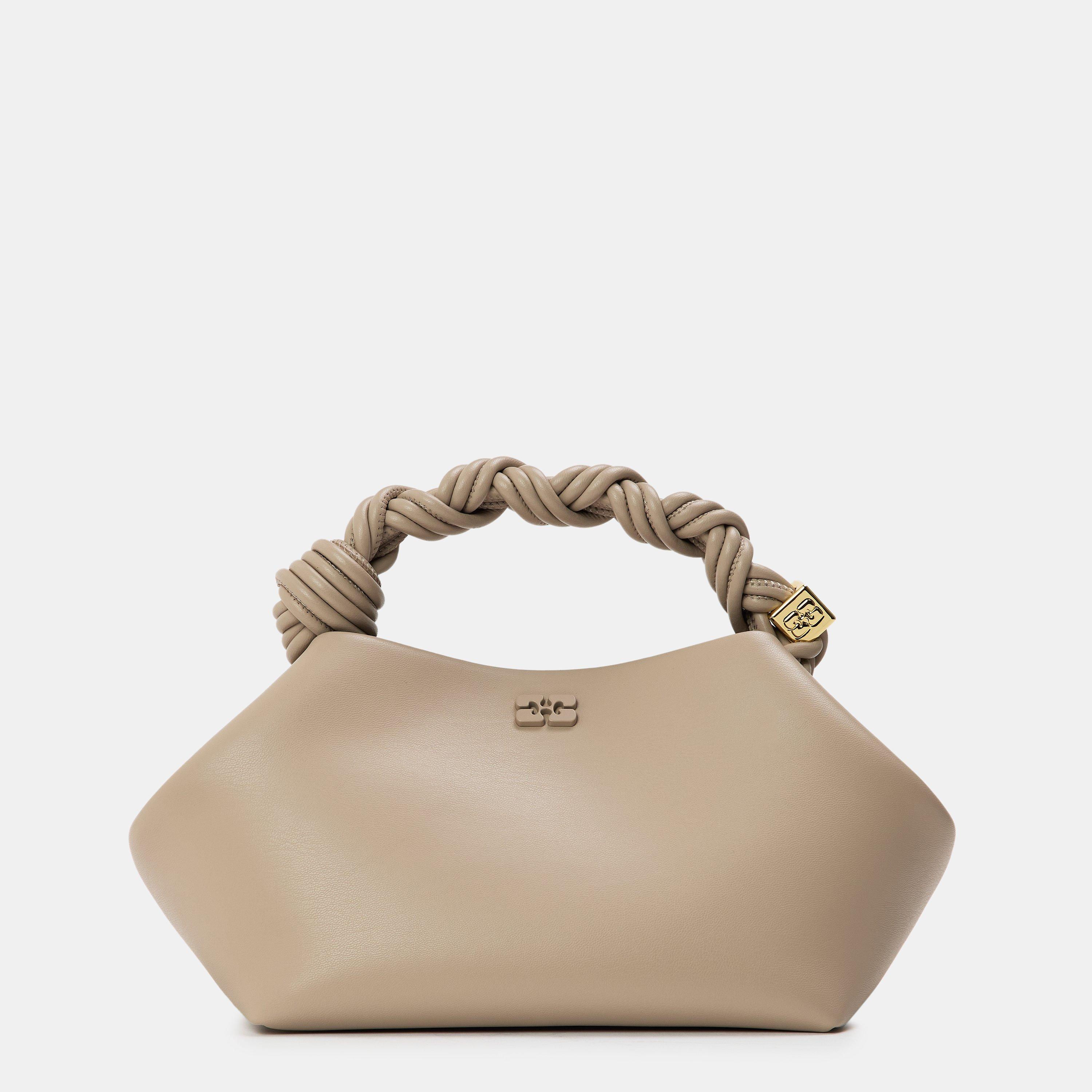 Contemporary design meets practical luxury with this distinctive crossbody bag from GANNI. The smooth leather construction features a unique twisted handle detail, adding an artistic touch to everyday accessories. A gold-tone hardware accent showcases the GANNI branding, while the compact silhouette maintains a modern aesthetic that works from day to night.