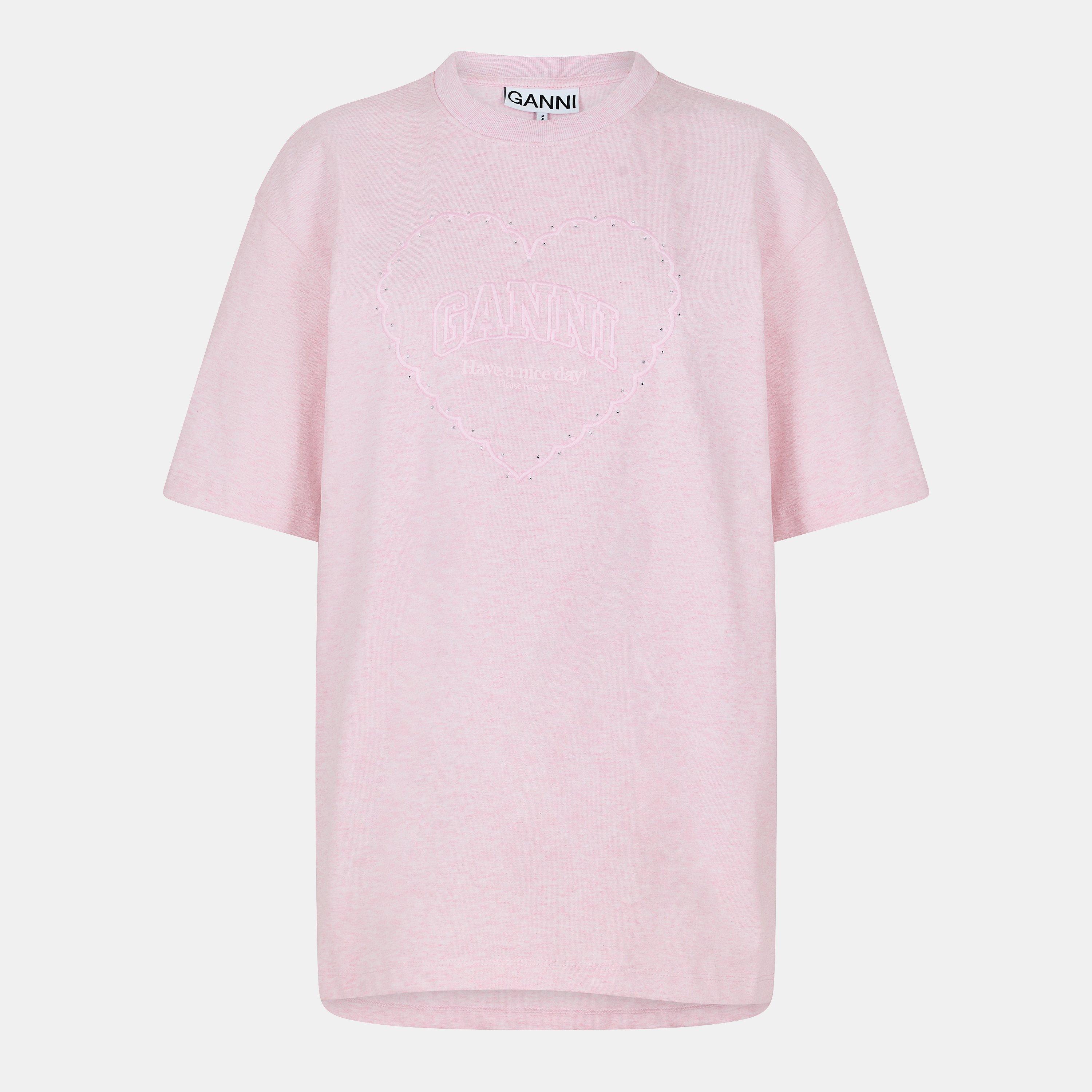 The Ganni Drop Shoulder T-Shirt is cut with lowered shoulder seams that shift the sleeve placement outward. The shape maintains a clean line without extra bulk.