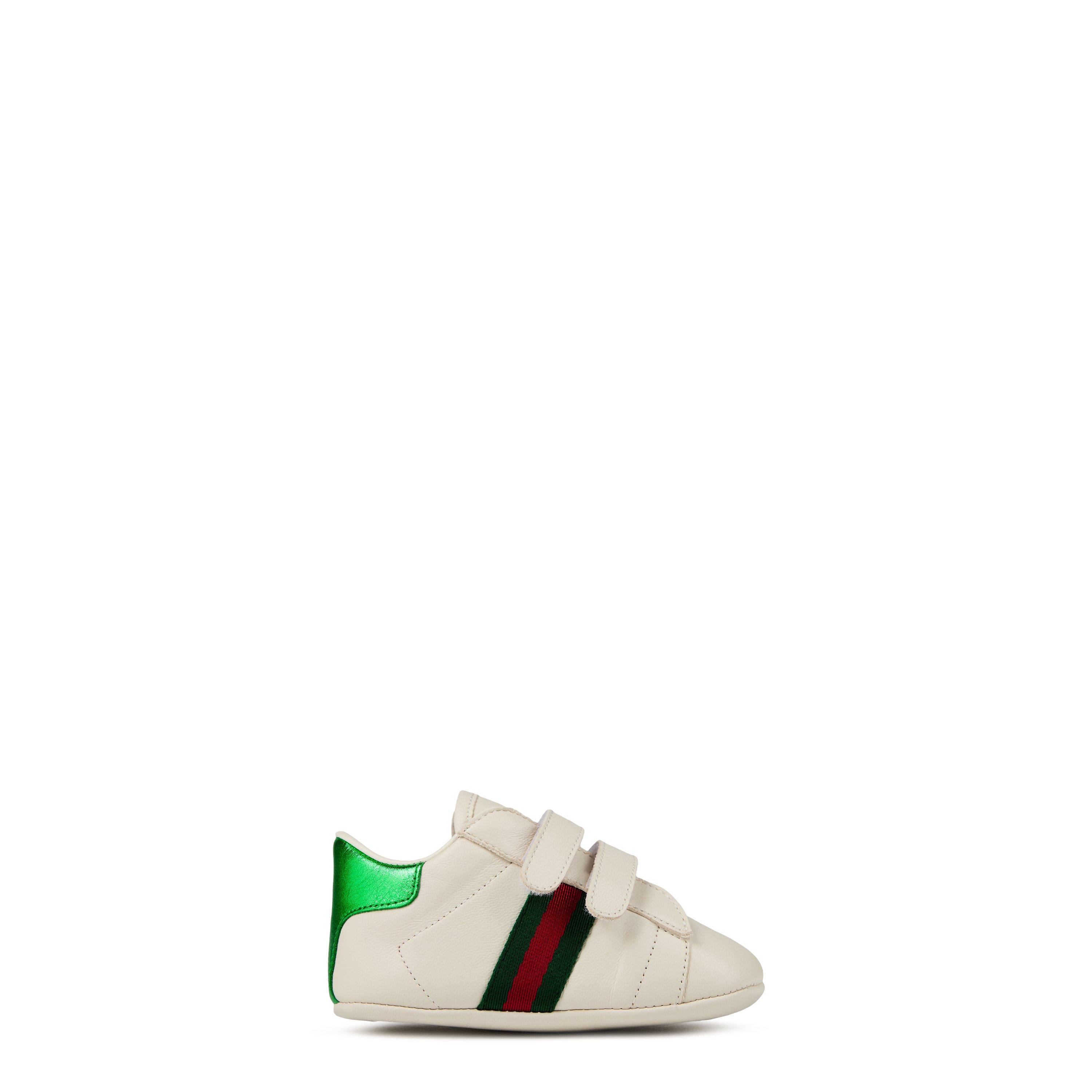 Gucci's New Ace Trainers for babies combine luxury style with practical design for your little one's casual footwear collection. These iconic infant shoes feature pristine white leather and the brand's signature green and red web stripe, perfect for first steps or playgroup adventures. The double touch-close fastening makes dressing simple while maintaining the refined aesthetic.