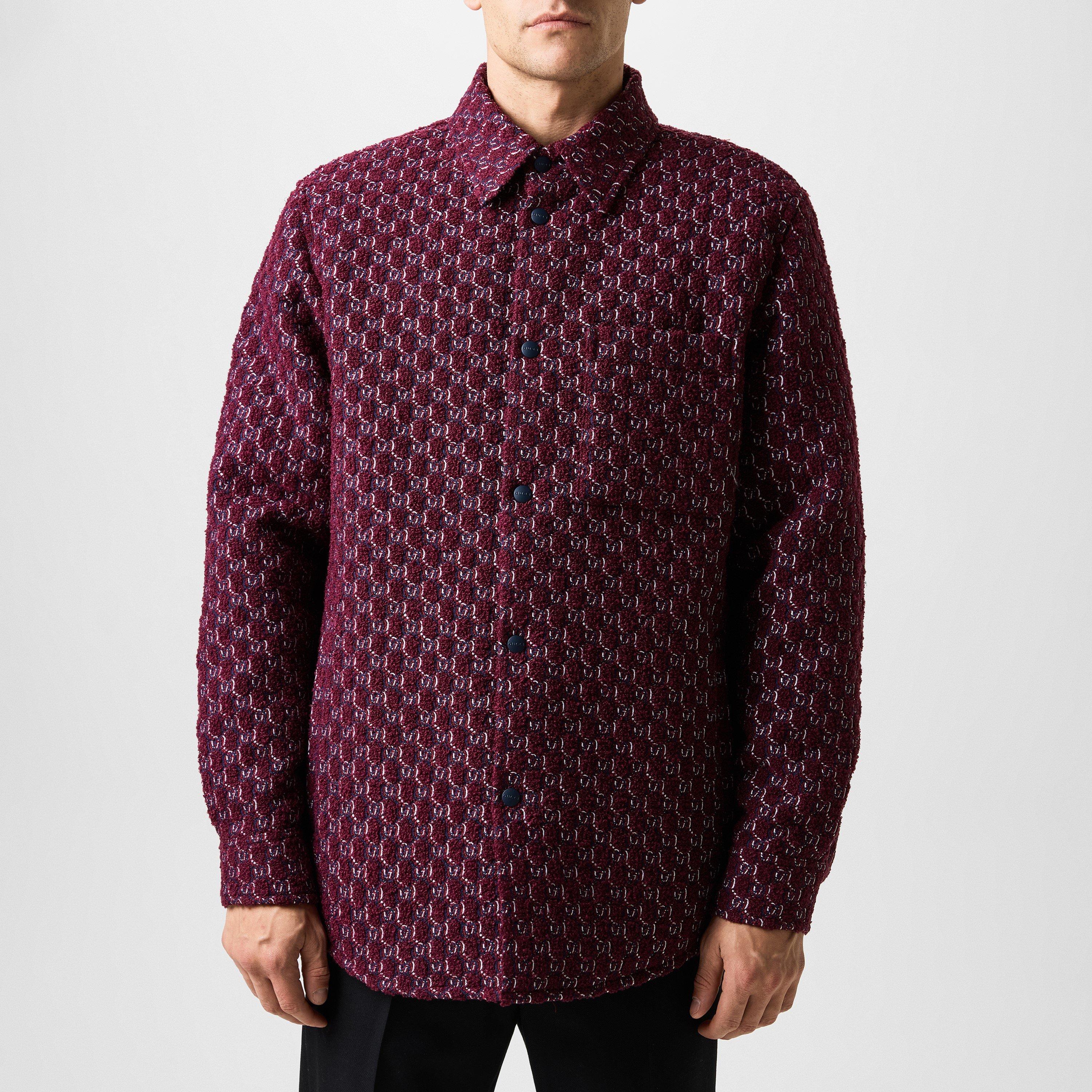 Gear up for a fashion revolution with Gucci's Boucle Jacquard Shirt With GG Shadow, a daring oversized shirt crafted from GG bouclé wool jacquard. This statement piece, featuring a contemporary optical effect and tonal lining, is the ultimate luxury layer for evening extravaganzas that demand sophistication.