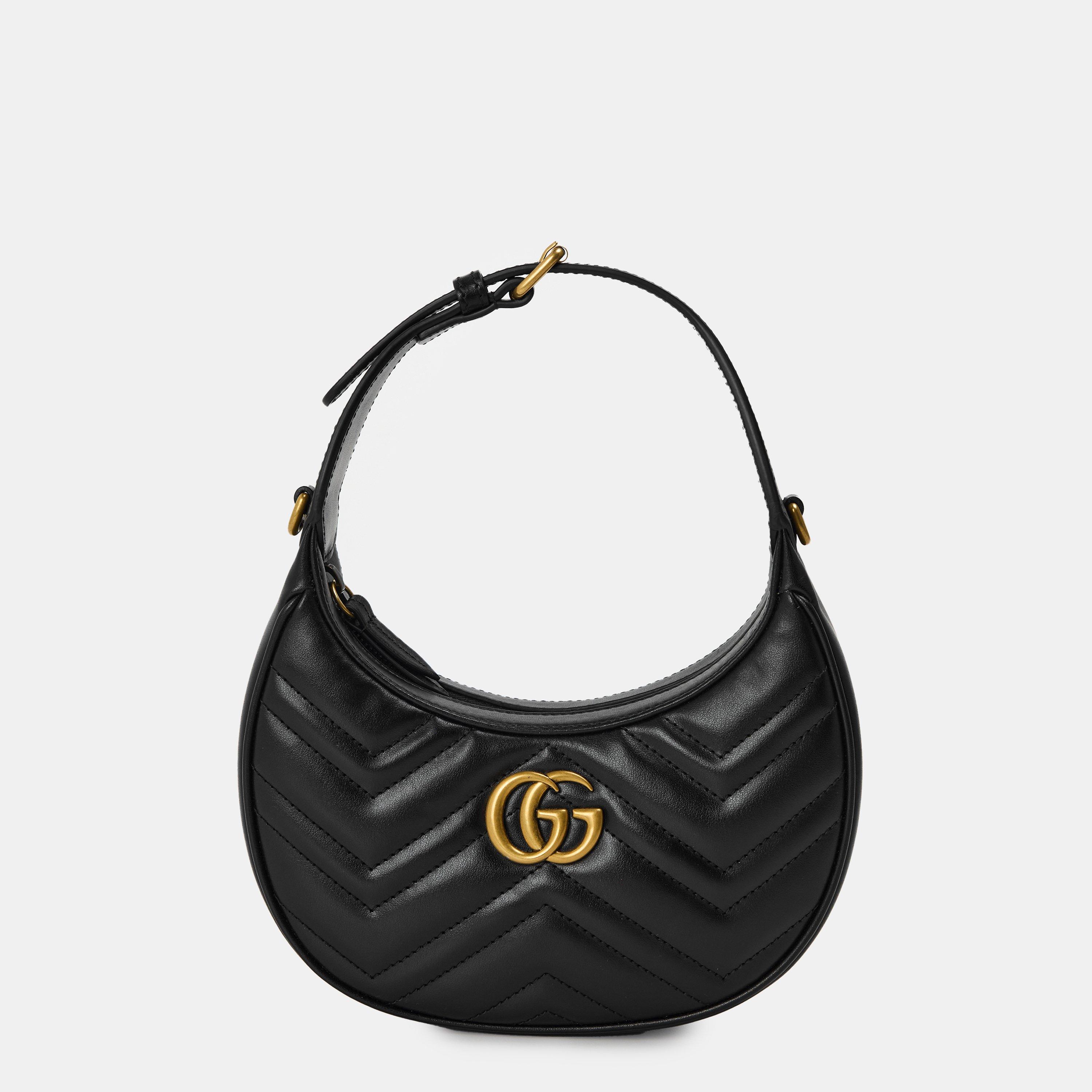 Gucci's GG Marmont Half-Moon Shaped Mini Bag is a luxurious Italian-made compact purse featuring the brand's iconic chevron leather and antiqued hardware. This crescent-shaped accessory combines vintage charm with modern functionality, perfect for both evening outings and city exploration.