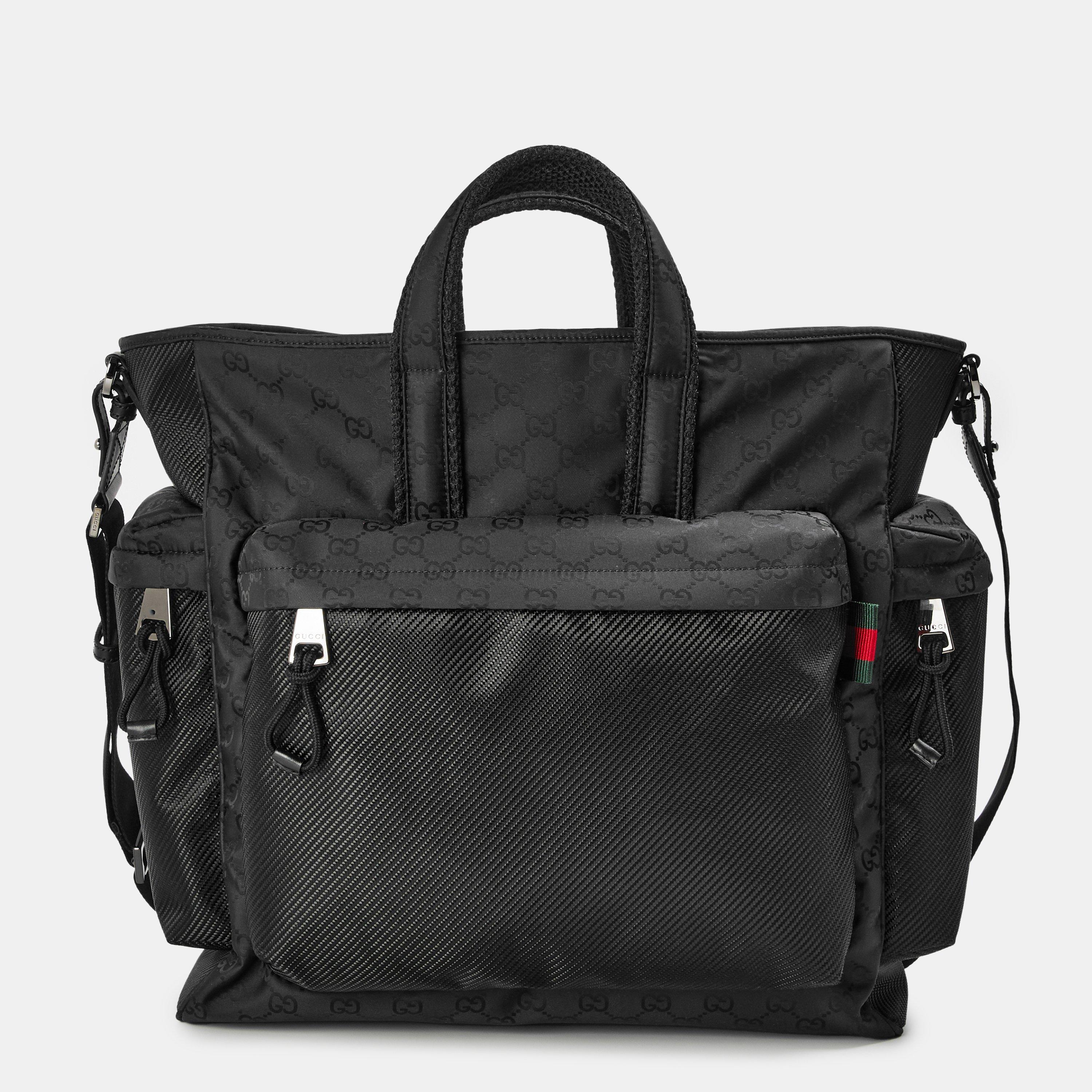 Part of Gucci's Cruise 2025 collection, the Nexus Large Tote Bag combines sleek design with sporty flair. Crafted from soft yet durable black nylon, it showcases the iconic all over GG motif and features the signature green and red Web detail. This versatile tote is perfect for everyday use or a weekend getaway, offering both style and functionality.