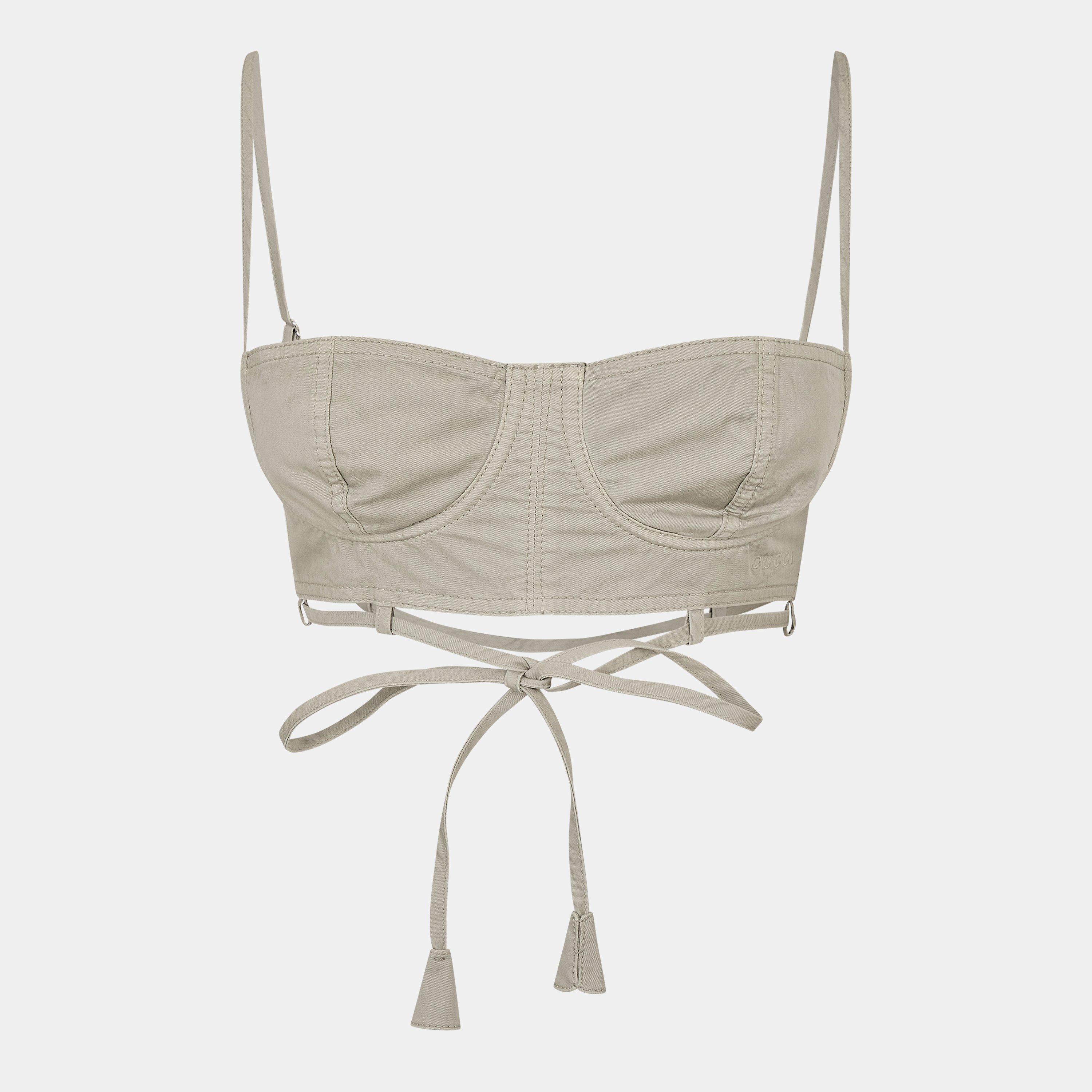 The Gucci Twill Top with Tie Detailing embodies casual grandeur, featuring a bralette-style silhouette garment-dyed for a lived-in look. Finished with subtle logo embroidery, this basic elevates everyday wear with refined touches. Perfect for layering or standalone style. Ideal for relaxed outings or chic casual gatherings.