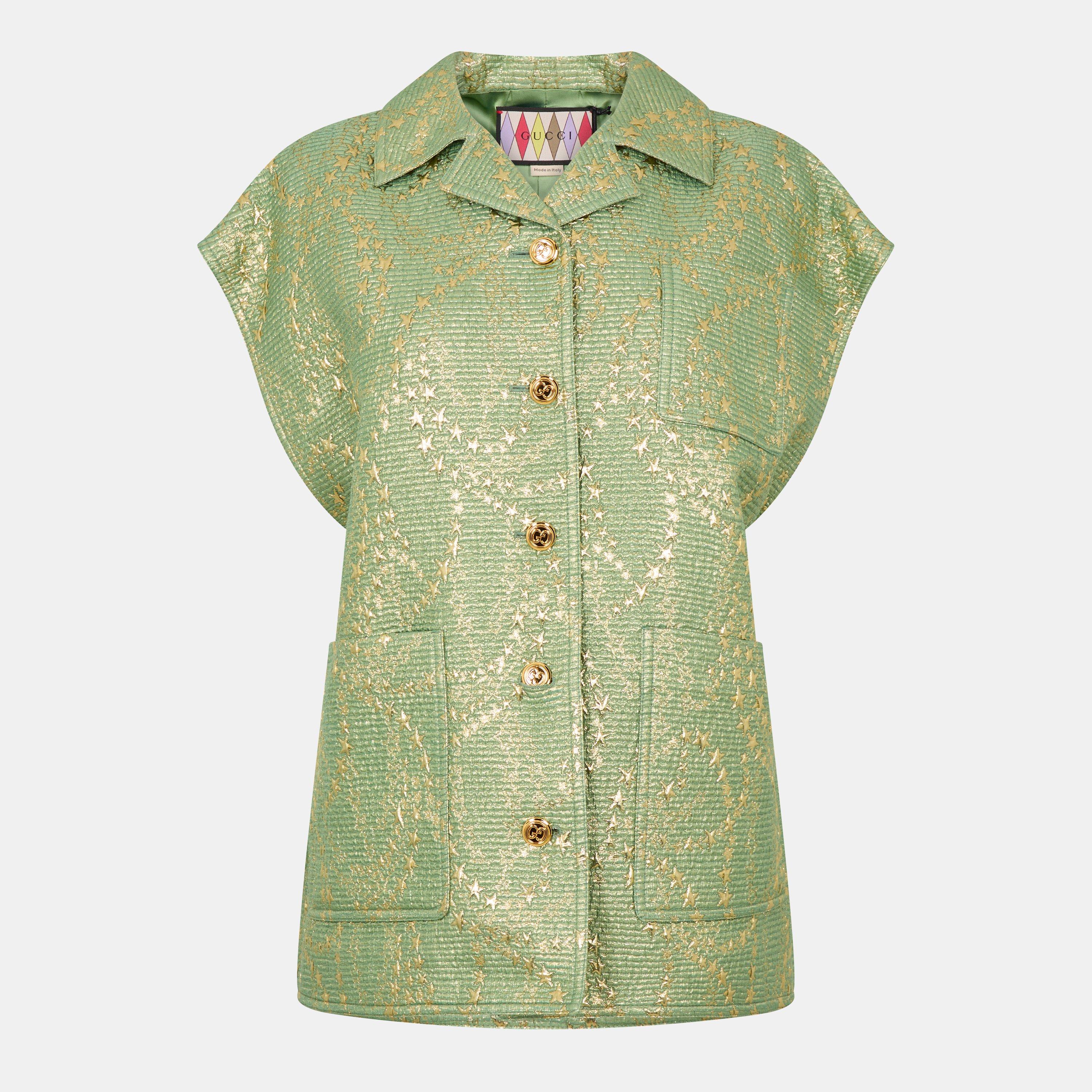 Gucci's Women's Wool Silk Gilet offers a sleeveless design with a structured, tailored shape. The combination of wool and silk creates a quality texture suited to layered or standalone wear.