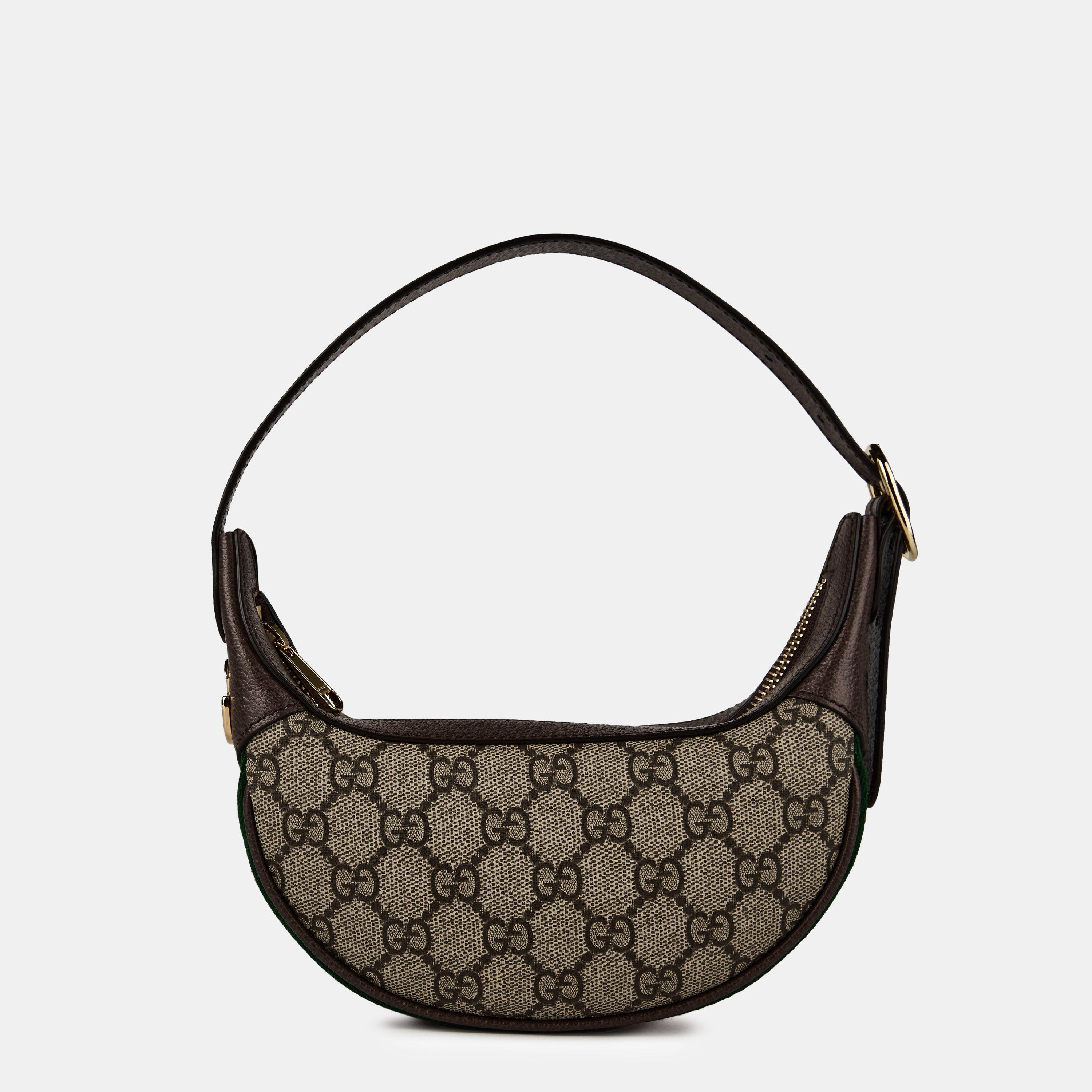 Gucci's Ophidia GG Mini Bag is a luxurious designer crossbody that blends retro appeal with modern functionality. This tiny, crescent-shaped handbag showcases the iconic GG monogram canvas and signature green and red web detail, perfect whether you're heading to weekend brunch or enjoying evening drinks. The compact purse offers just enough space for daily essentials while maintaining a refined, graceful shape.