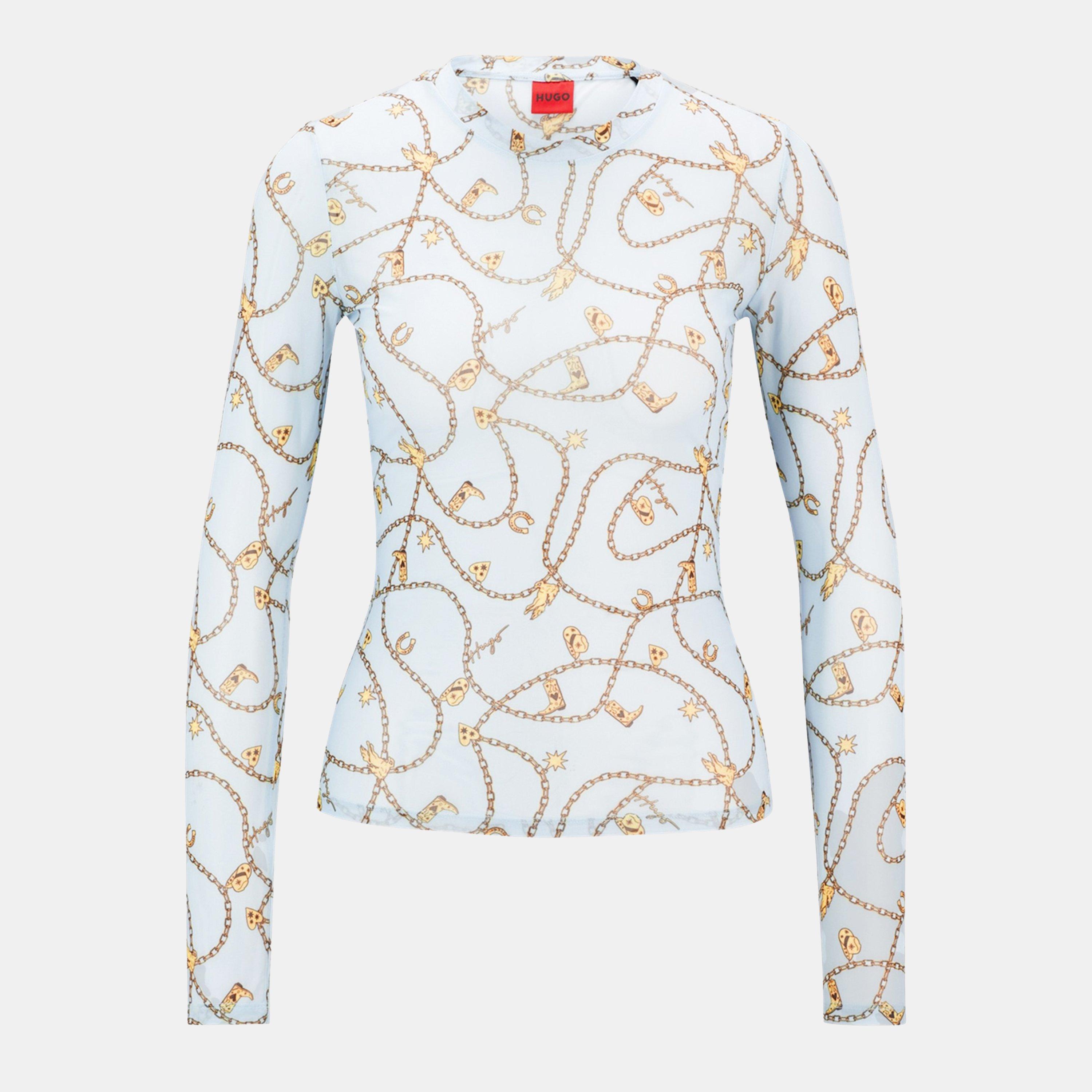 The enchanting world of Hugo unveils the captivating Diralina Mesh Top, crafted from a luxurious polyester blend stretch mesh, this top embraces a slim, tailored fit that accentuates your silhouette.