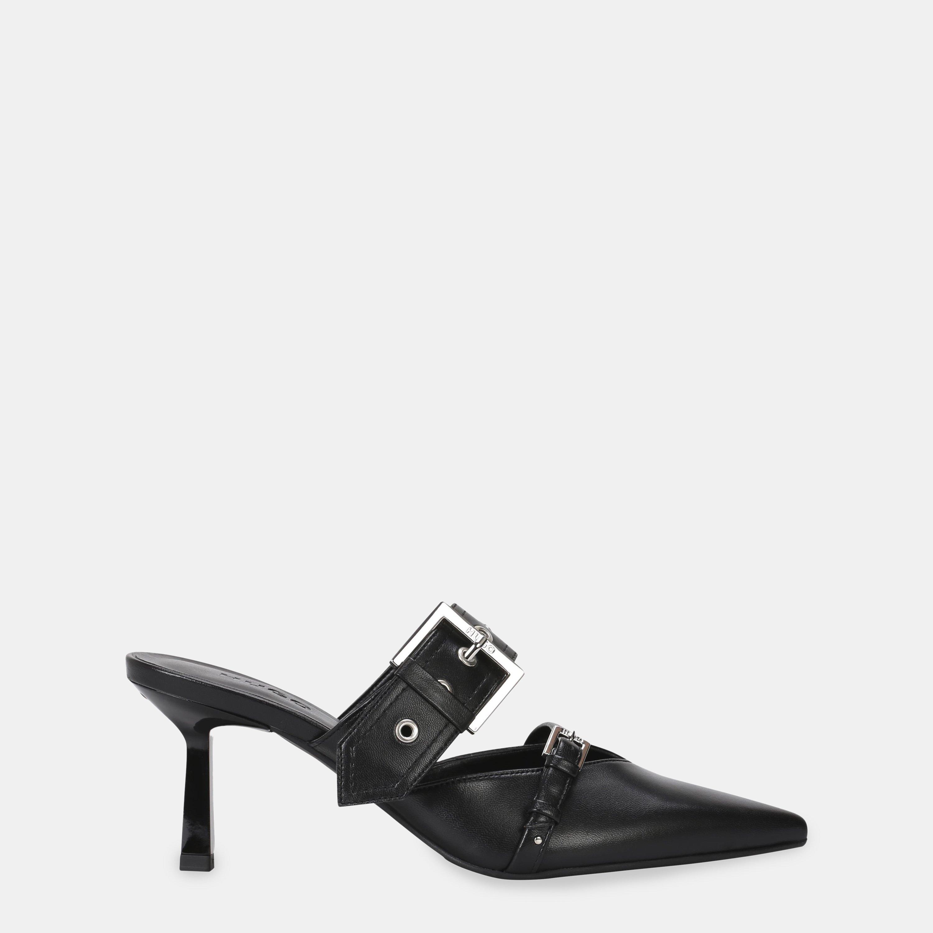 Stylish, chic and statement making these Katniss Mules from Hugo are sure to turn heads on your next night out. With a pointed toe and statement buckle details, these mules offer a glamourous elevation to your ensemble. From days at the races to sophisticated soirees, these mules keep you stylish.