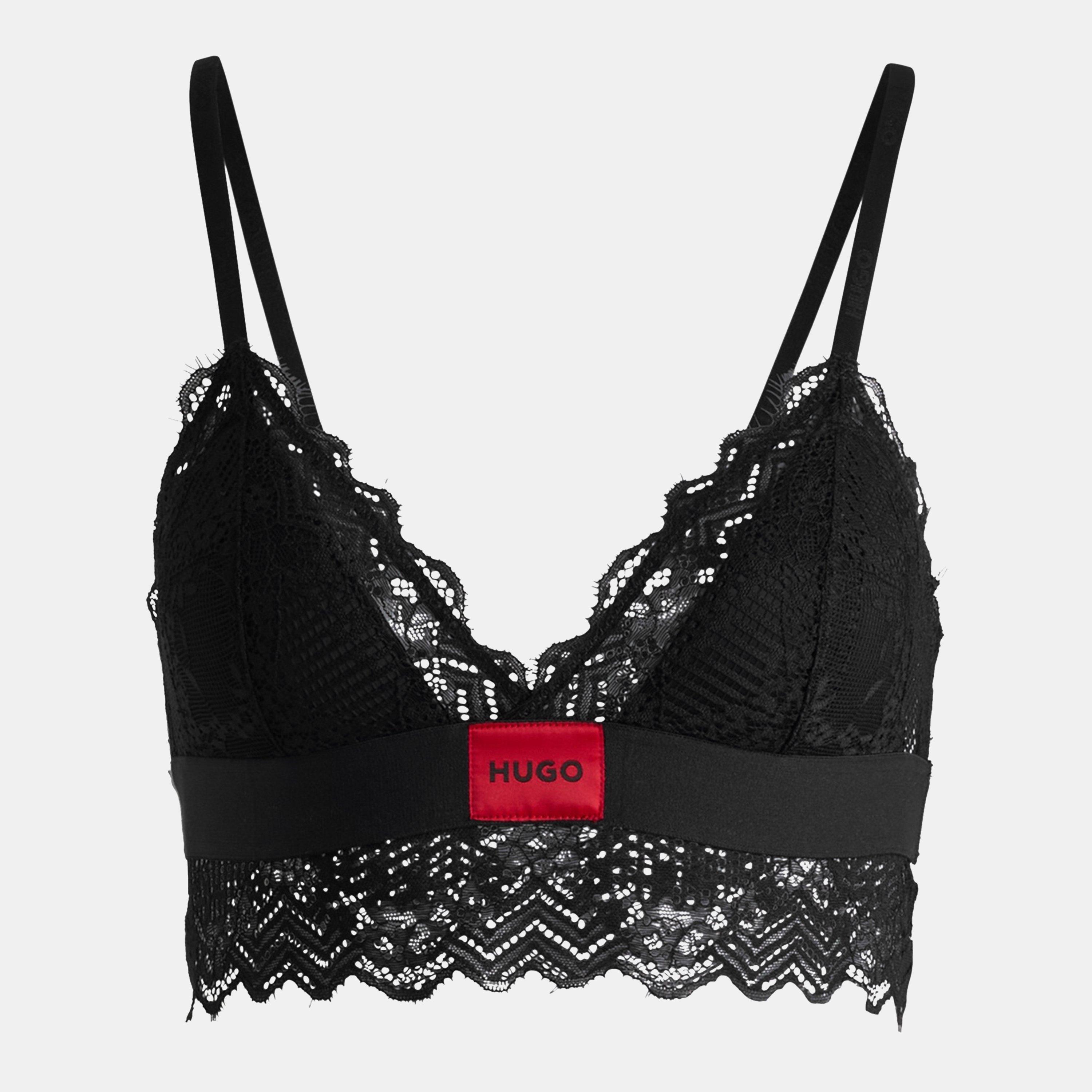 Rejuvenate your underwear with this elegant and flirty Lace Triangle Bralette from Hugo. Crafted from 85% polyamide and 15% elastane this bralette comes in a v neck construction, with adjustable straps for a adaptable and comforting fit. With an elasticated hemline allowing for a more stretchy fit, the bra cups are padded with sheer for additional comfort and support. The look is finished in a solid black elegant laced design, which offers a stylish and feminine look. The iconic brand label is stitched into a patch on the front which gives a deluxe finish to the bra. Garment Care: Hand Wash Only, Do Not Bleach, Do Not Tumble Dry, Do Not Iron, Do not chemical dry clean