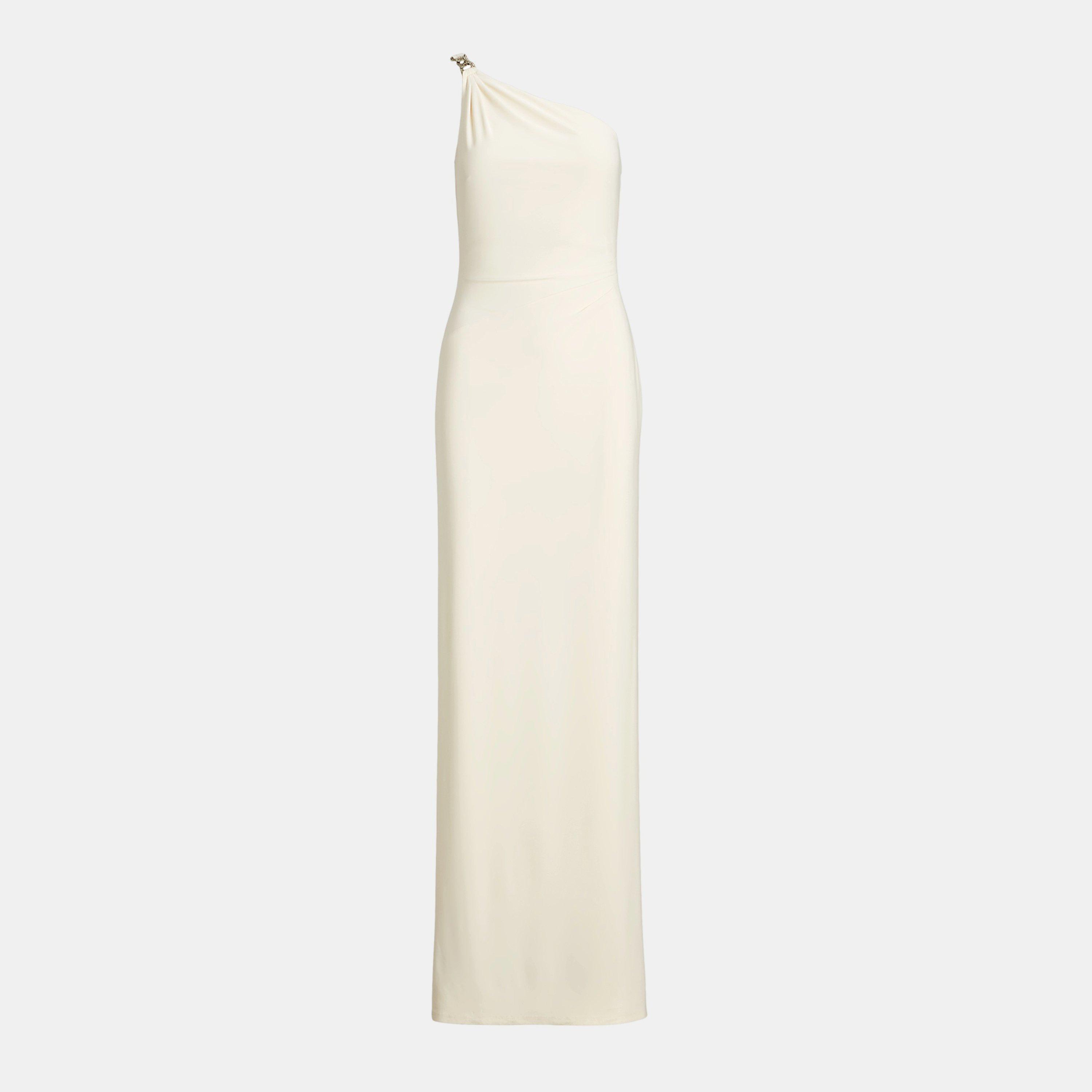 Introducing the exquisite Lauren by Ralph Lauren Belina Dress, where style meets elegance effortlessly. Crafted from premium polyester and elastane, boasting a comfortable feel against the skin. The slim fit and fully lined construction exude a timeless appeal, while the one-shoulder silhouette offers a touch of glamour. Complemented by a left-side-seam slit and delicate ruching at the waist, the maxi dress radiates tasteful allure. Featuring a concealed centre-back zipper for ease of wear, and a rhinestone-embellished chain-link accent on the shoulder strap providing a timeless charm.