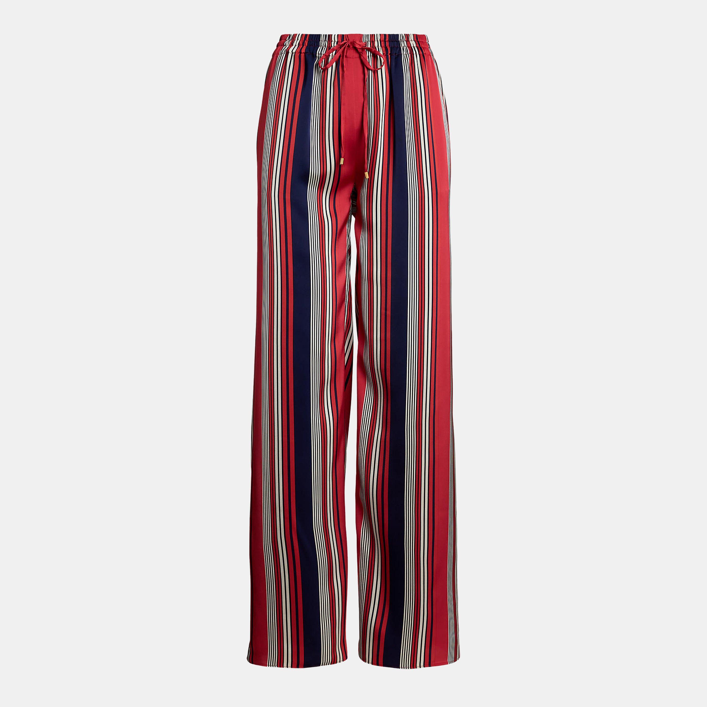 Elevate your wardrobe with these Striped Charmeuse Wide-Leg Trousers, designed for a lustrous sheen and a fluid drape. Distinguished by a chic wide-leg silhouette, the trousers are refreshed with a variegated striped pattern in the season's nautical-inspired colour palette. Perfect for sophisticated evenings, stylish getaways, or effortlessly polished daywear.