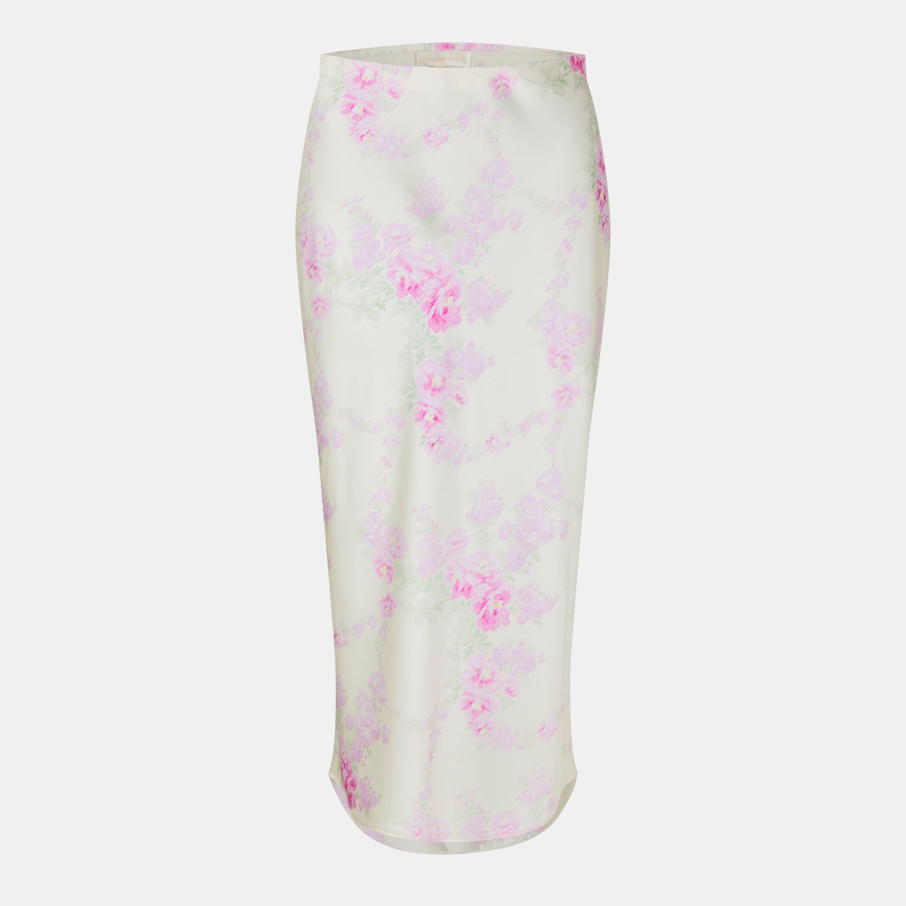 Defined by its structured A-line shape and pleated waistband detail, the LoveshackFancy Castle A-Line Lace Midi Skirt creates a striking profile.