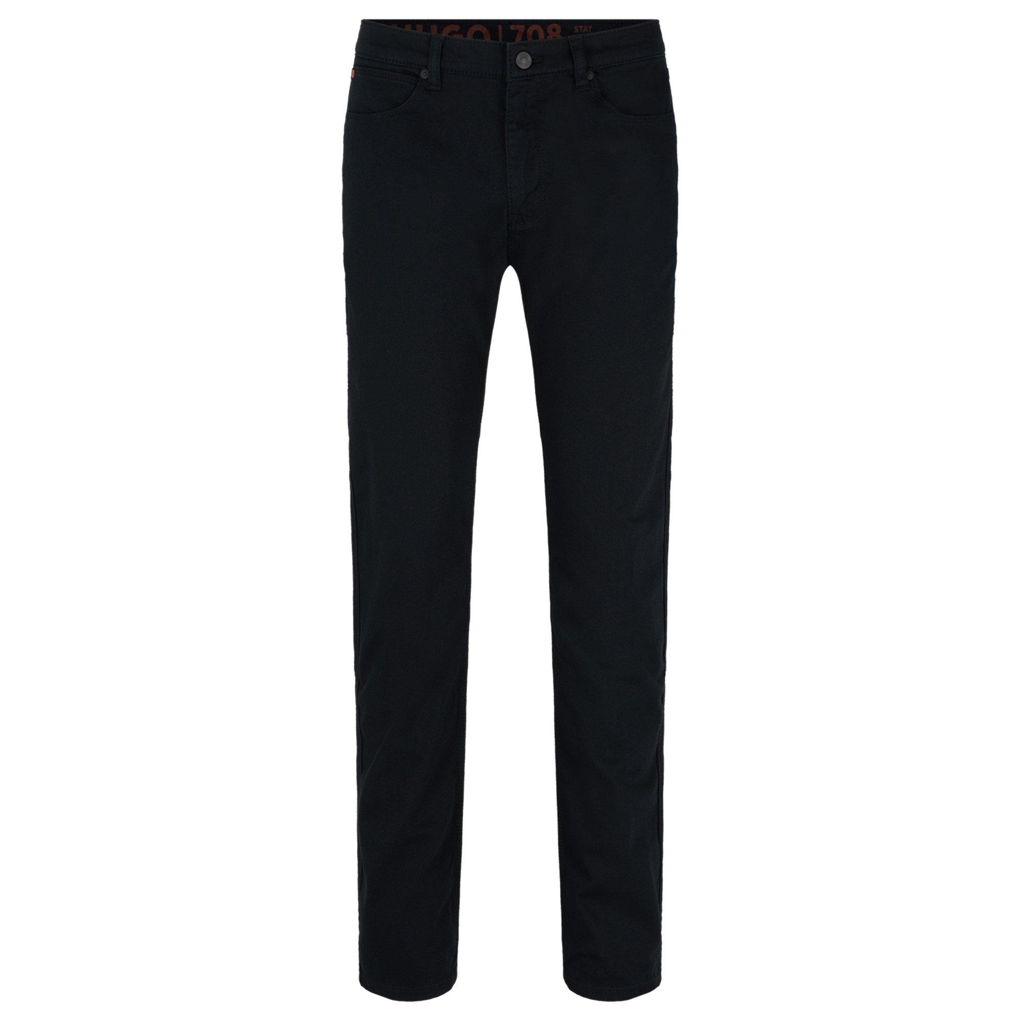 Premium denim meets modern design in these HUGO 708 slim-fit jeans. A wardrobe essential that pairs seamlessly with casual and smart attire, these jeans offer a contemporary silhouette that sits comfortably on the hips and maintains a sleek line through the leg. The classic five-pocket design features subtle HUGO branding details, including a small red tag accent and branded waistband.