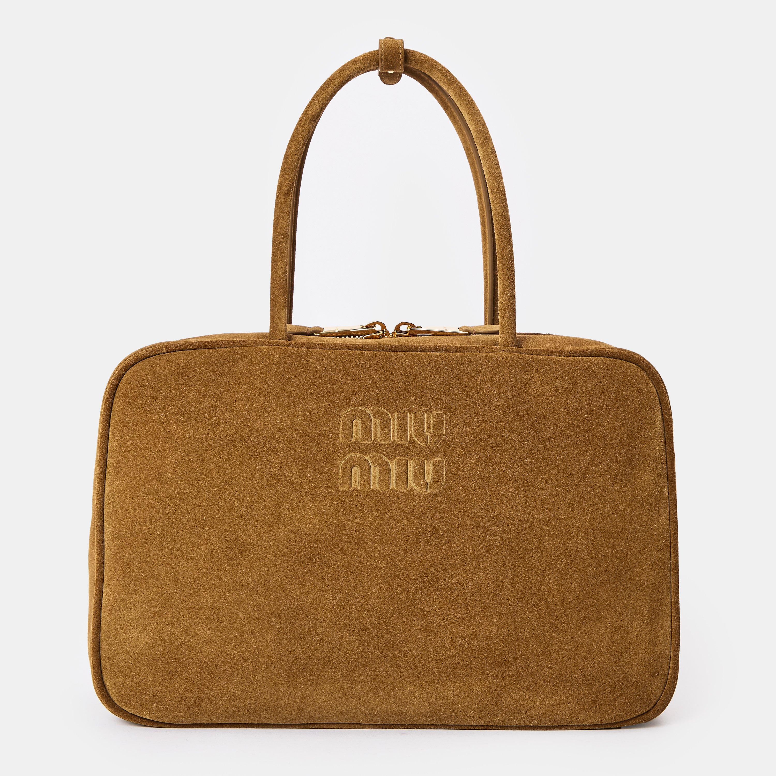 Miu Miu's top handle bag features a structured shape with practical functionality. This accessory combines a clean design with everyday usability, offering a balanced approach to both style and purpose.