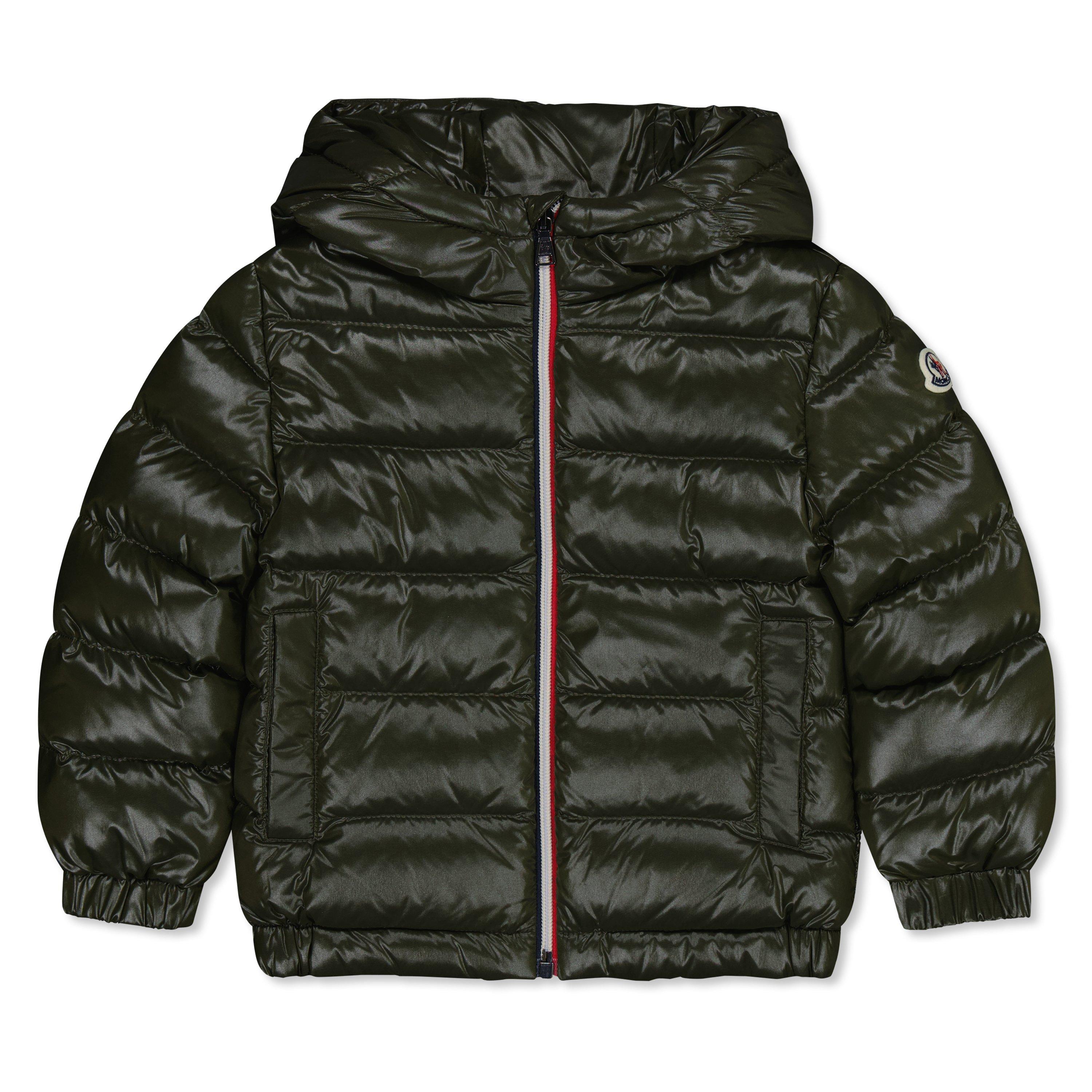 - Felt logo patch on sleeve adds Moncler heritage to kids' adventuresbert Down Jacket: the perfect treat for your youngster. Meticulously crafted from premium nylon laque, this design boasts a sleek and durable design built to withstand any weather conditions. A hooded neckline provides added protection from the elements, while the long sleeves with elasticated cuffs offer a snug and comfortable fit. The central zip fastening ensures a snug fit and is flanked by two welt pockets for easy and convenient access to essentials.
