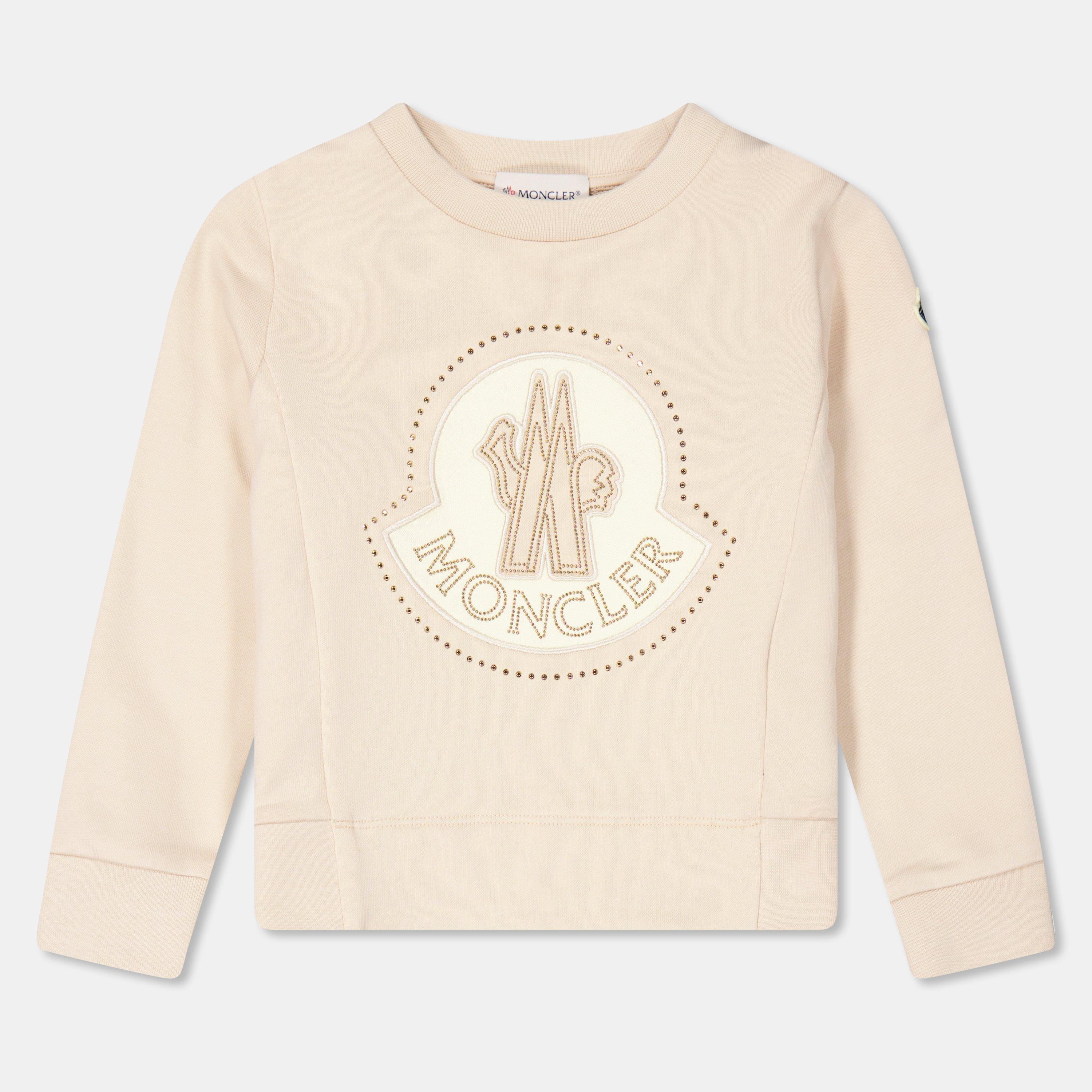 Moncler’s Logo Crewneck Jumper for kids showcases a bold embroidered logo on the chest, enhanced by subtle glitter accents for a fun sparkle. Designed with a classic round neckline, long sleeves, and finished shoulders featuring a stylised emblem, it blends timeless style with playful details. Perfect for family outings or festive occasions.