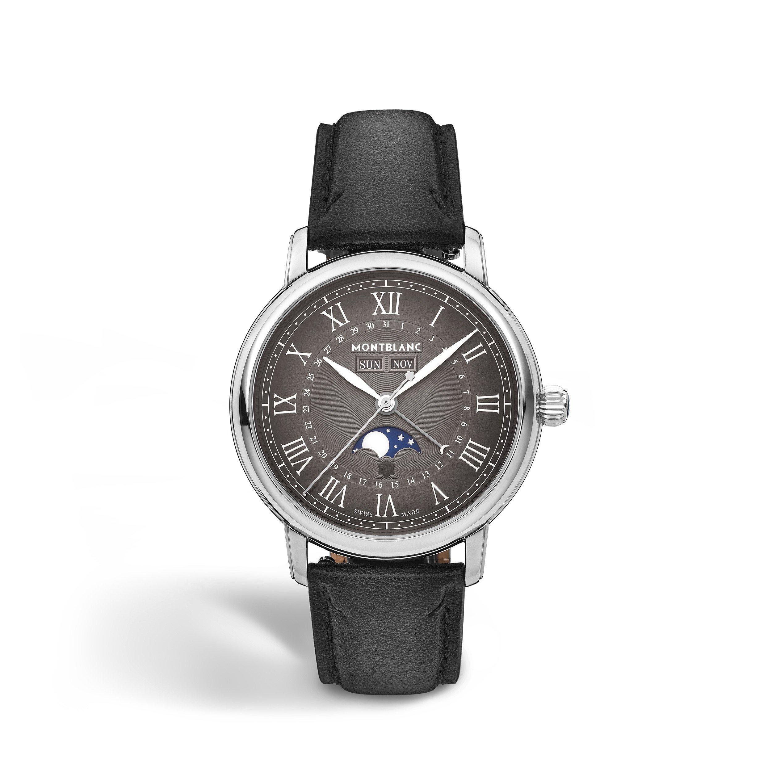 Montblanc's Moonphase Automatic Analogue Watch unites horological excellence with celestial artistry. The self-winding automatic movement powers both traditional timekeeping functions and the intricate moonphase complication, all housed within a case that exemplifies Montblanc's commitment to fine watchmaking. This distinguished fashion timepiece represents the fusion of technical precision and wristwatch design.