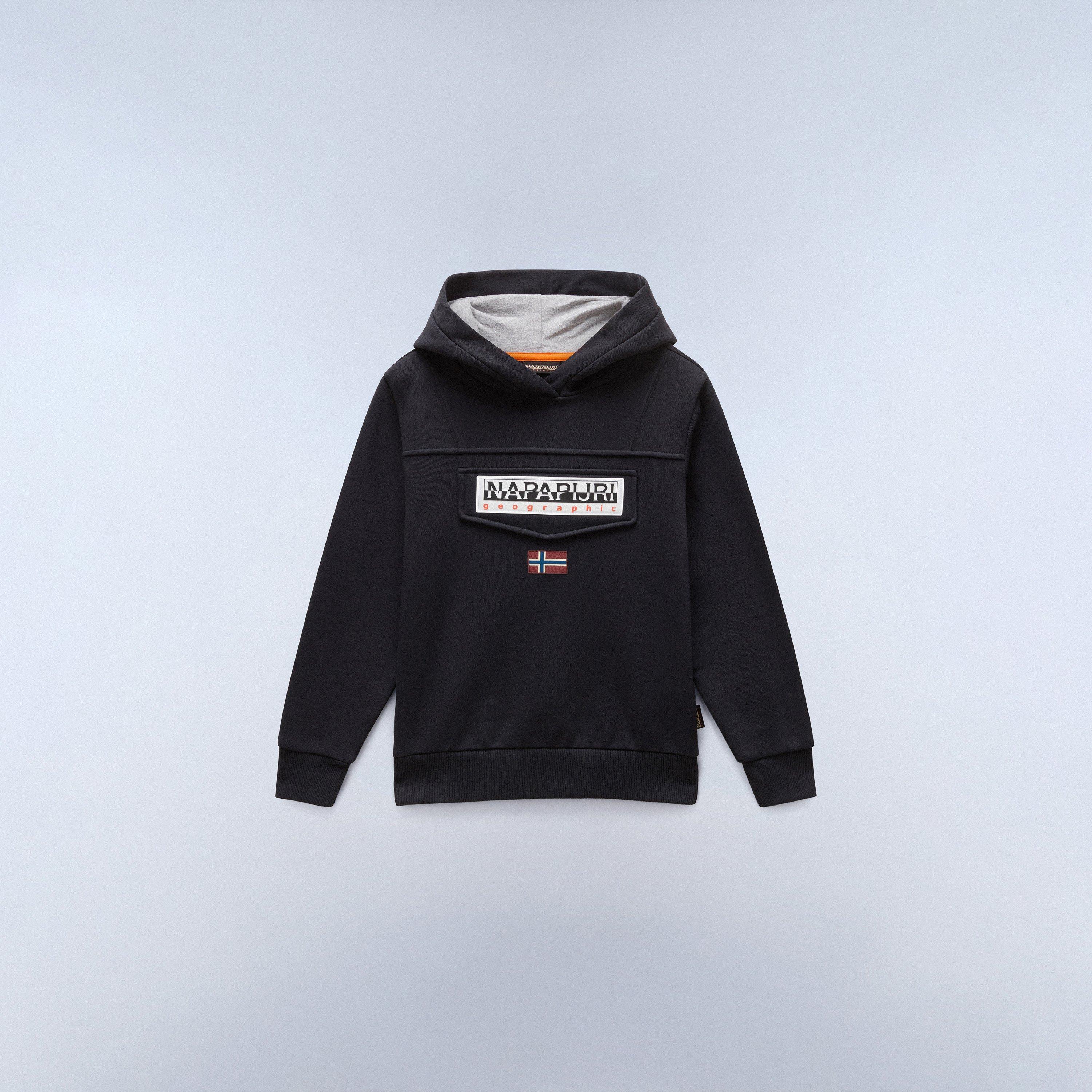 The Kids' Burgee Pullover Hoodie from Napapijri features a kangaroo pocket and adjustable hood. The flag emblem adds a notable outdoor detail.