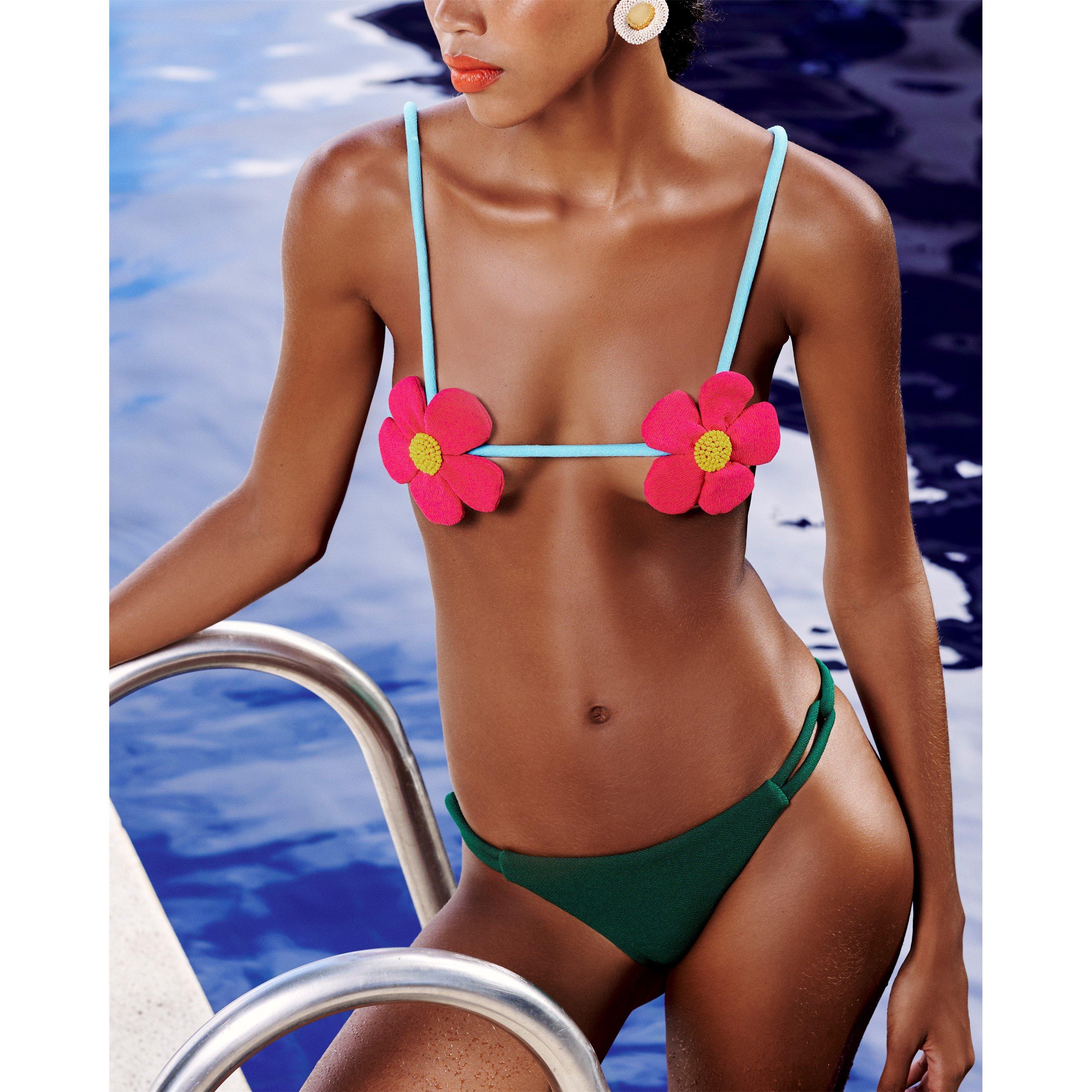 The Daisy Bikini Top is an hand-crafted statement top made from stretch crepe fabric. It features hand-sewn petals with a beaded center. Adjustable tubular straps. Minimal coverage and meant for smaller chest sizes. Fully lined and runs true to size.
