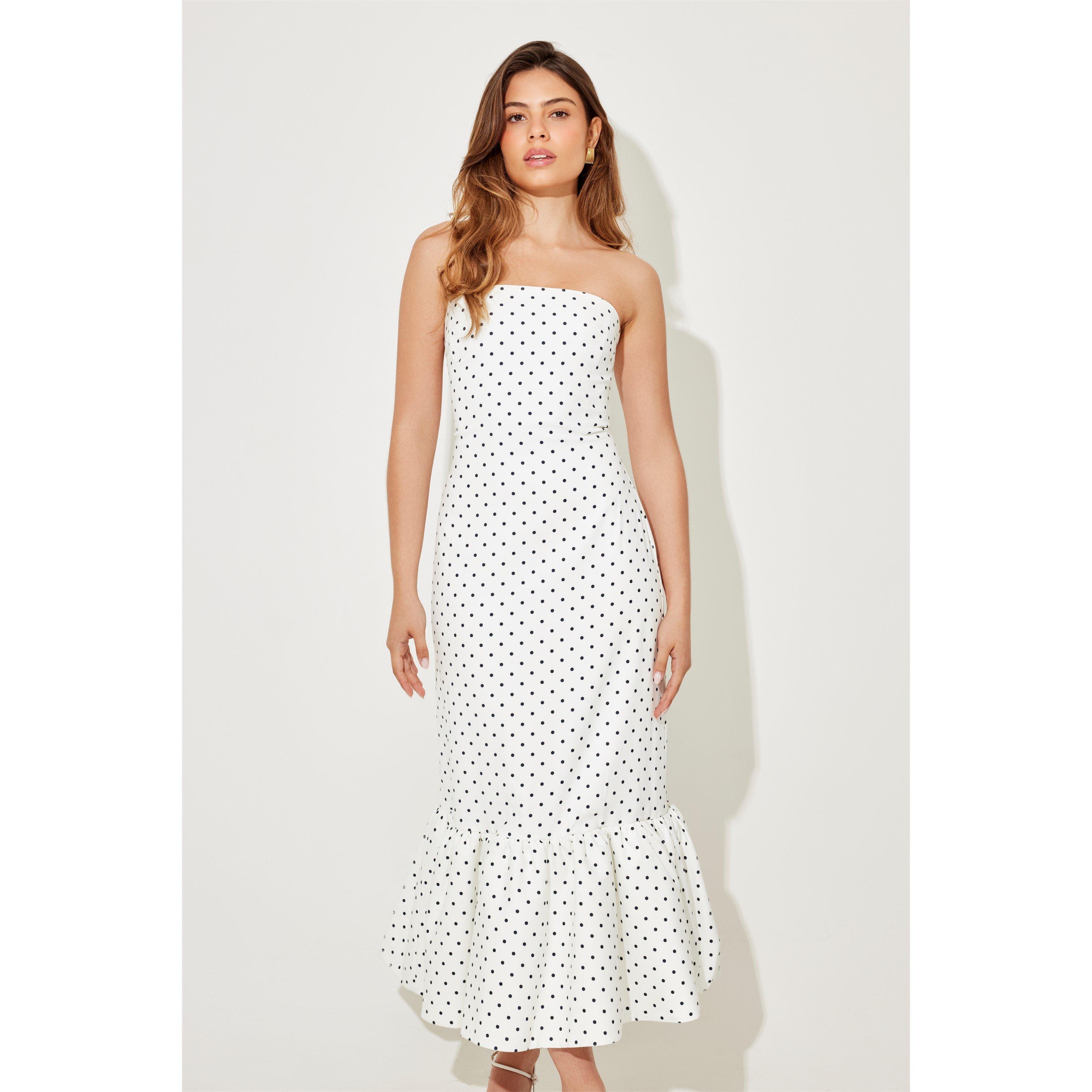 Timeless yet fun, the Odd Muse Ultimate Muse Strapless Peplum Hem Midi Dress combines classic polka dots with a flirty tiered hem. Its flowing silhouette exudes effortless grace and charm, perfect for making a statement. Ideal for garden parties, summer soirées, or elevating your everyday wardrobe with a touch of sophistication.
