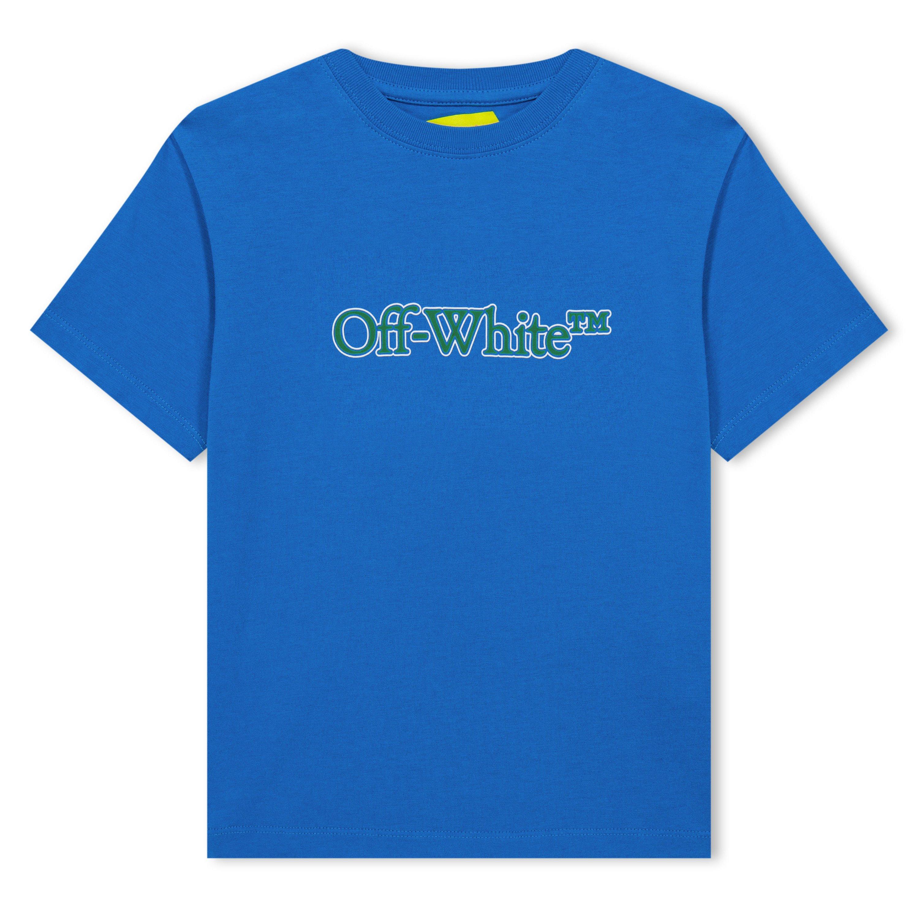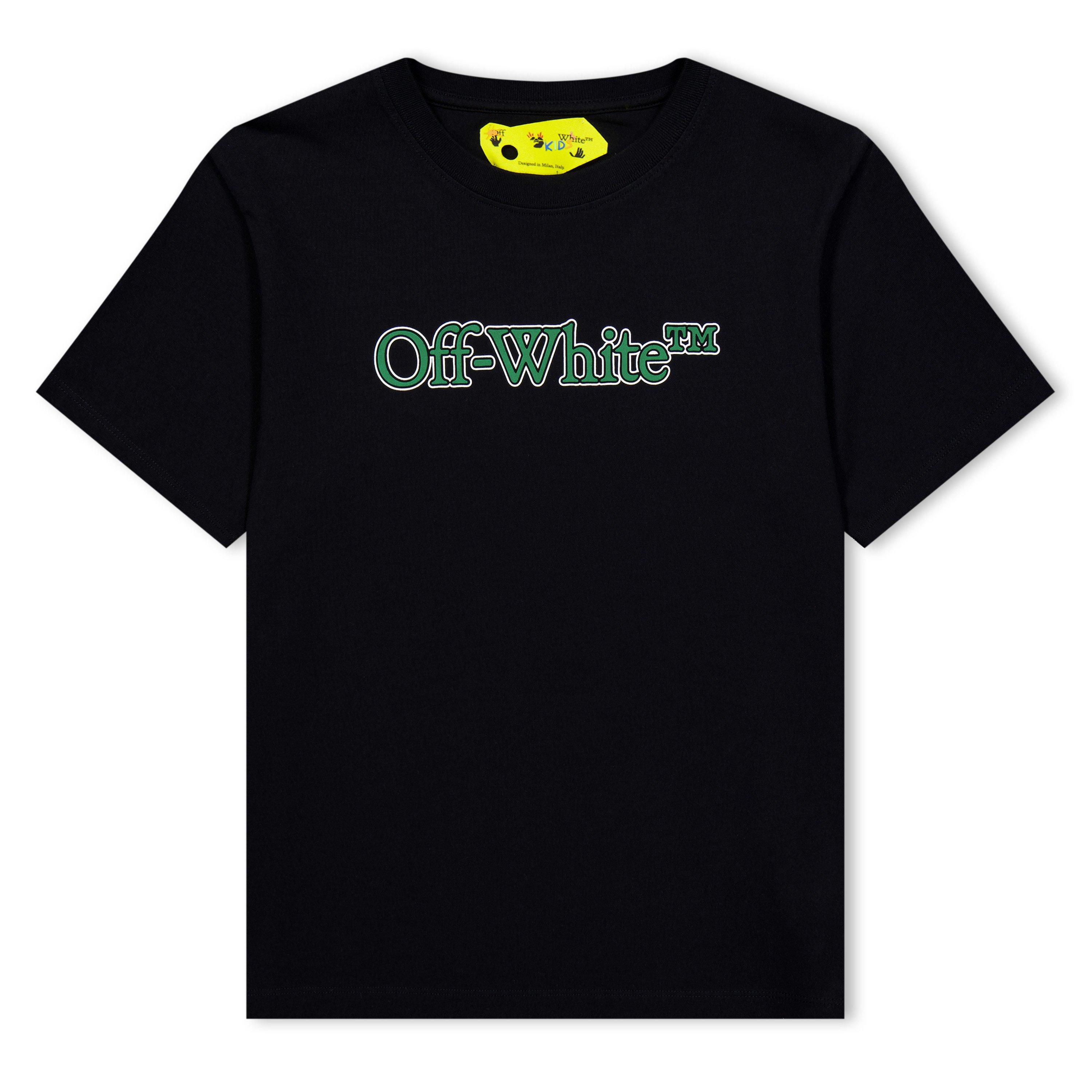 Off-White's Kids' Bookish Cotton Logo T-Shirt merges literary references with bold streetwear style. This regular-fit short sleeve crew-neck features a prominent chest logo against a minimalist background, delivering authentic brand identity with a straight-edge hip cut and quality cotton fabrication.