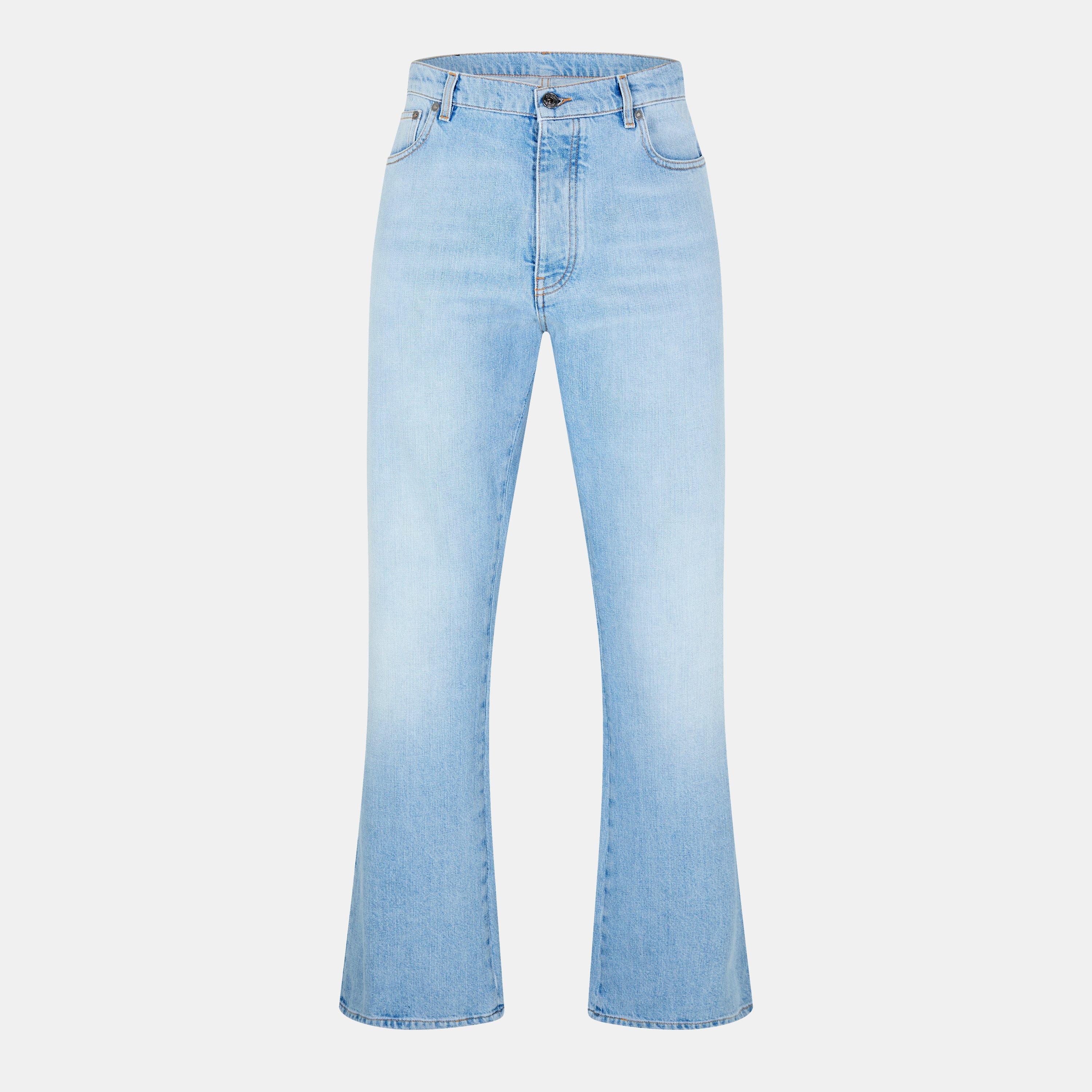- Diagonal branding detail positioned across the denim