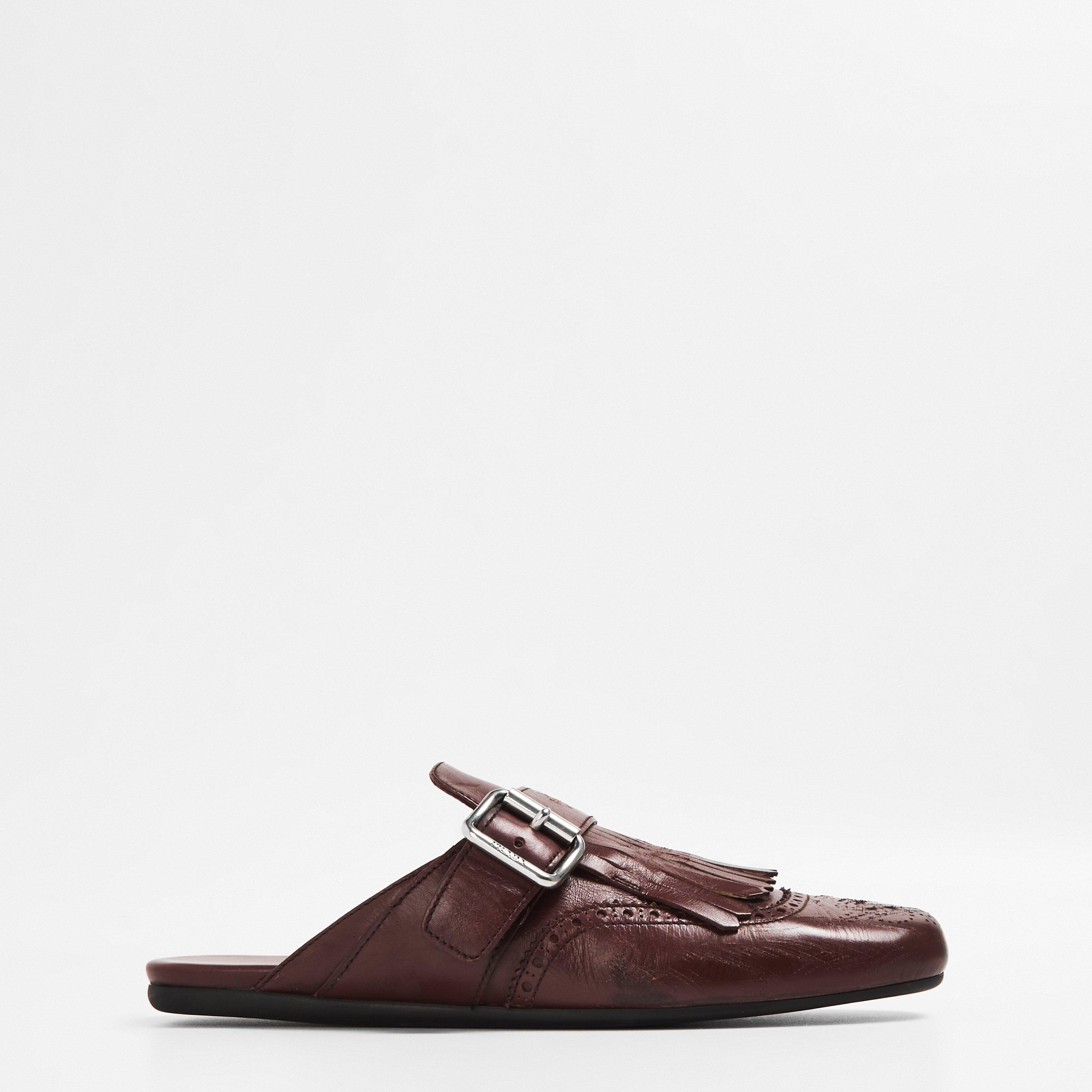 Prada reimagines a heritage classic through a contemporary lens with these deconstructed leather mules. Crafted with an antiqued finish, the upper showcases refined brogue perforations and traditional fringe detailing—elements that nod to timeless formal wear while embracing a relaxed, modern silhouette. Finished with a minimalist rubber sole and an engraved logo buckle, the design strikes a balance between artisanal craftsmanship and everyday ease.