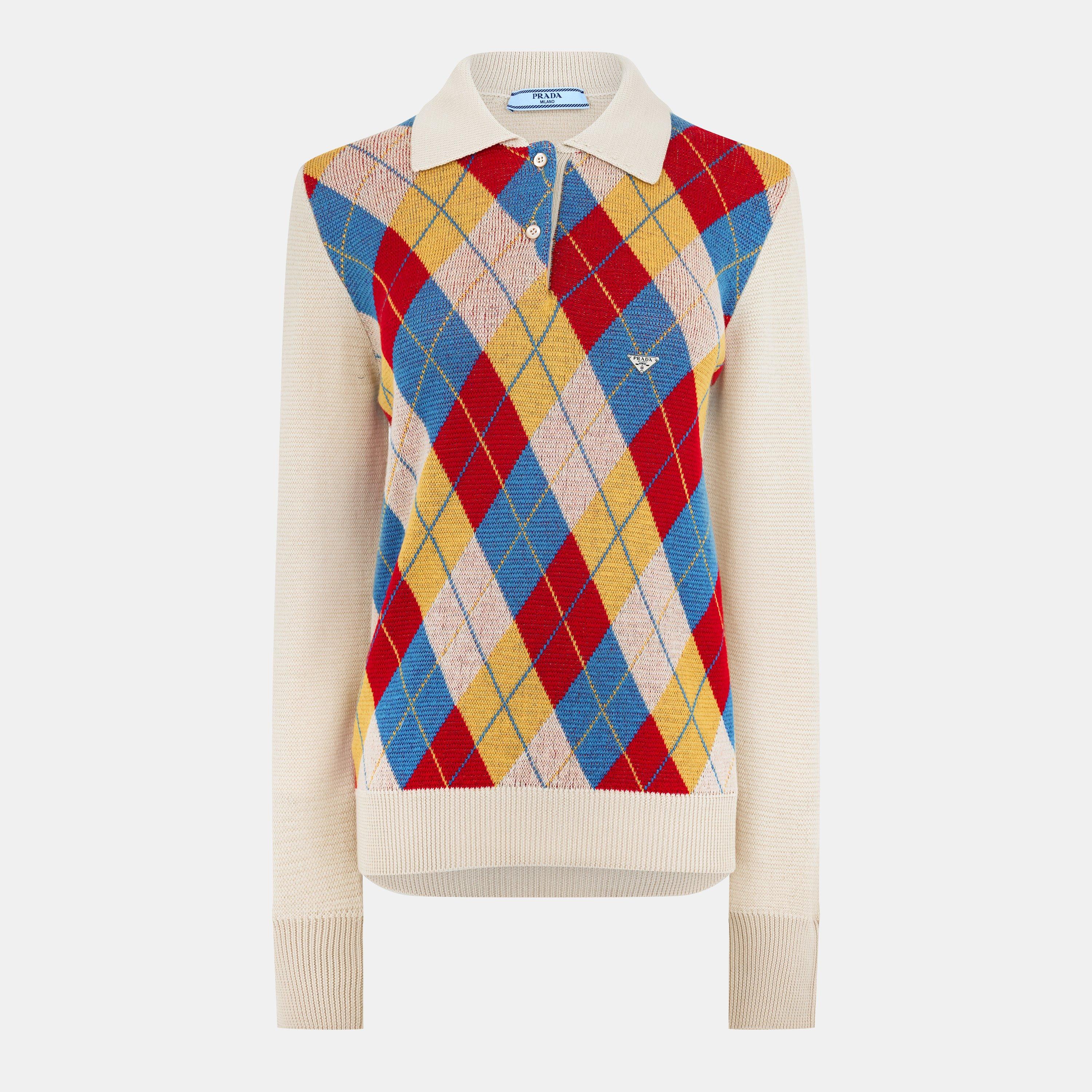 The Prada Long Sleeve Argyle Polo Shirt combines timeless elegance with modern sophistication. It's long-sleeves provide an effortlessly sleek silhouette, while the argyle motif adds a charming, vintage look. Completed with an enameled metal Prada triangle logo on the chest, this piece is a perfect blend of retro appeal and contemporary style. Perfect for chilly walks, drinks in the city or candle lit dinners.