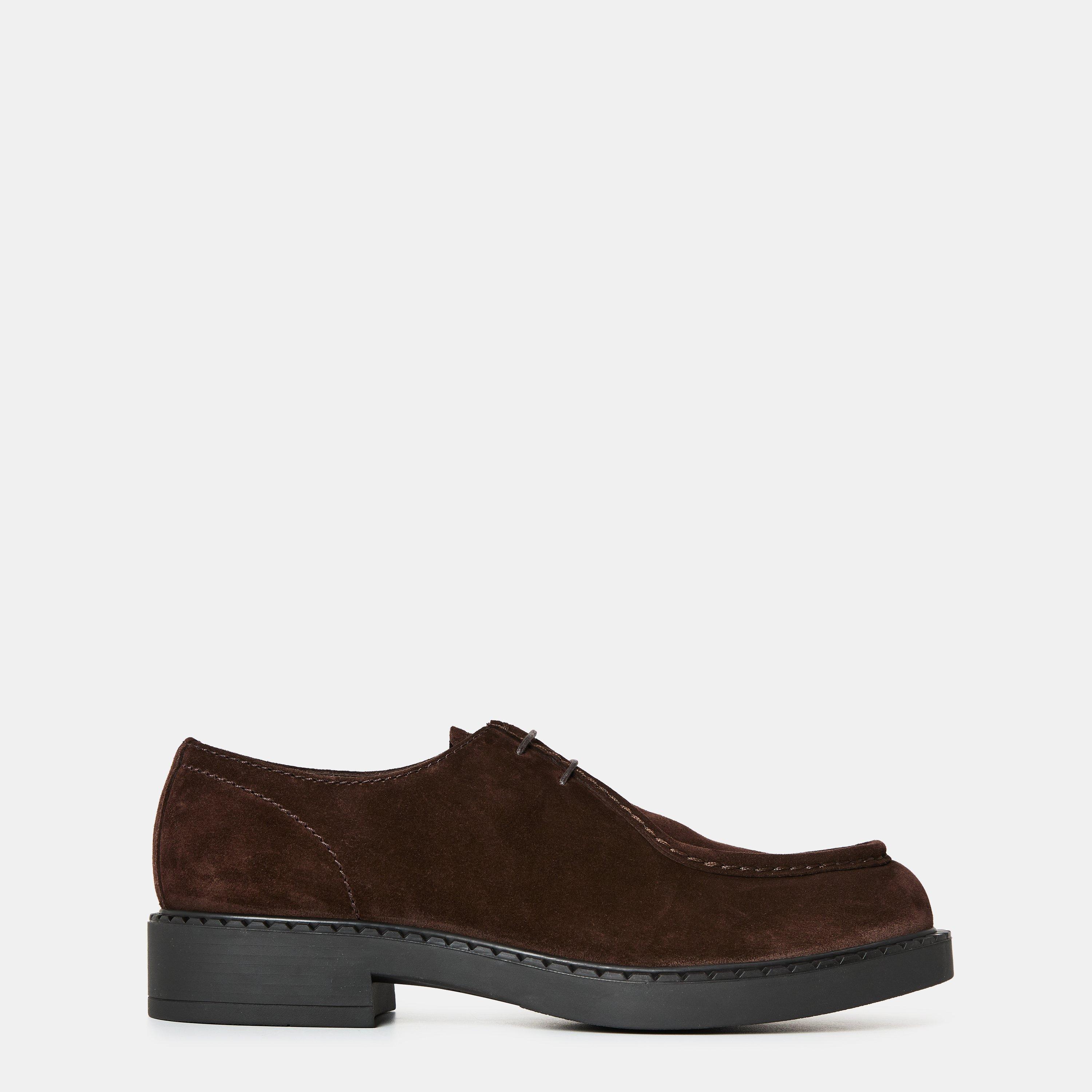 Prada's Chocolate Metal Hardware Loafers. These distinguished designer shoes feature clean lines and a contoured shape, complemented by subtle metallic hardware that showcases the brand's fashion aesthetic for the modern man.