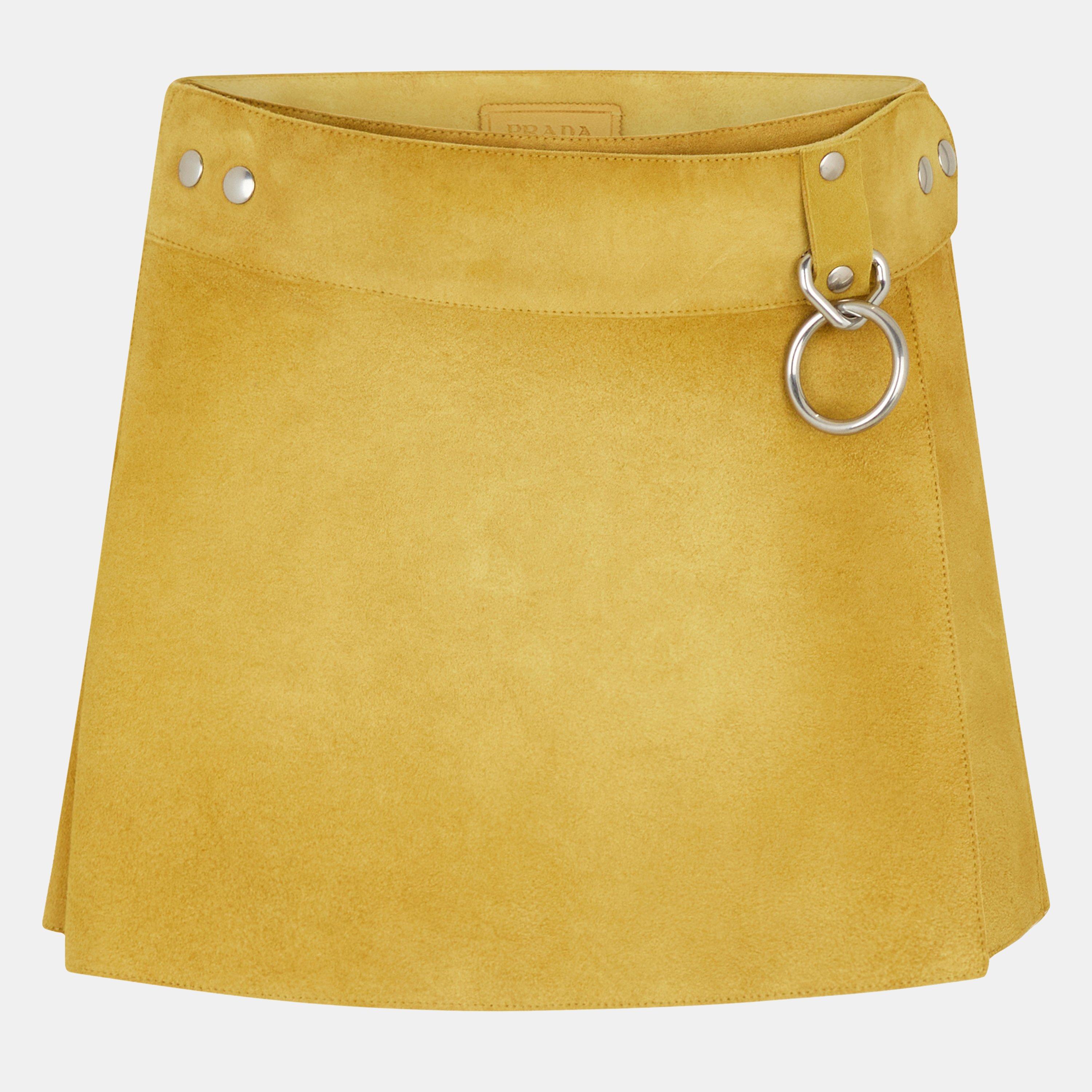 Indulge in luxury with Prada's Suede Mini Skirt, a brand renowned for blending Italian style with modern, avant-garde designs. Adorned with the signature logo at the hem, exuding a sleek designer touch. From stylish events to chic soirées, this mini skirt makes a statement wherever you go.