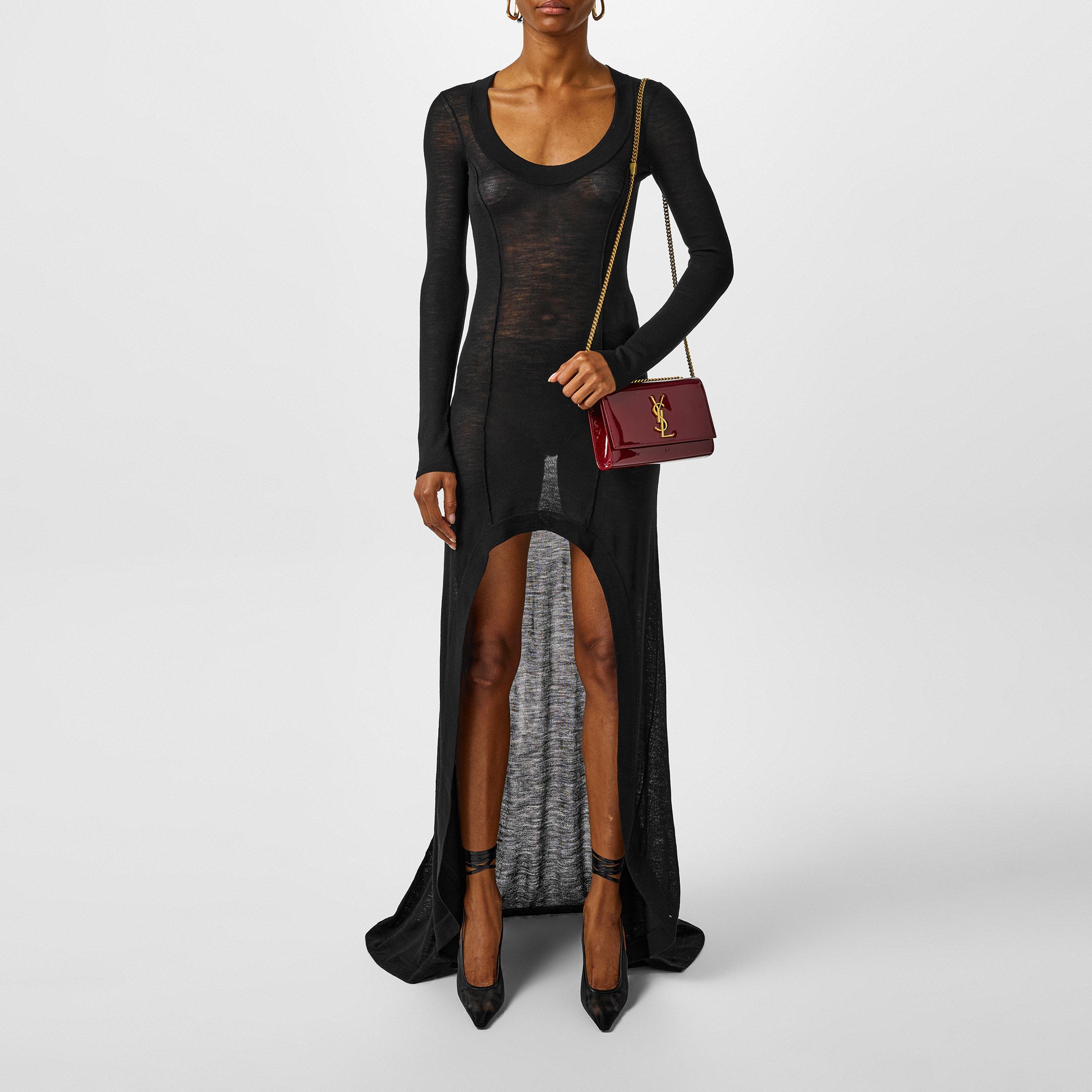 Perfect for soaking up summer vibes, this Saint Laurent Asymmetrical Design Dress brings timeless elegance to your wardrobe. Crafted from extra-fine wool for a luxurious touch, the striking cutout front with a flowing train leaves you feeling as sophisticated as you look. Perfect for making an impression at cocktail evening, turning heads at upscale soirées or covering up on unforgettable evenings by the sea.