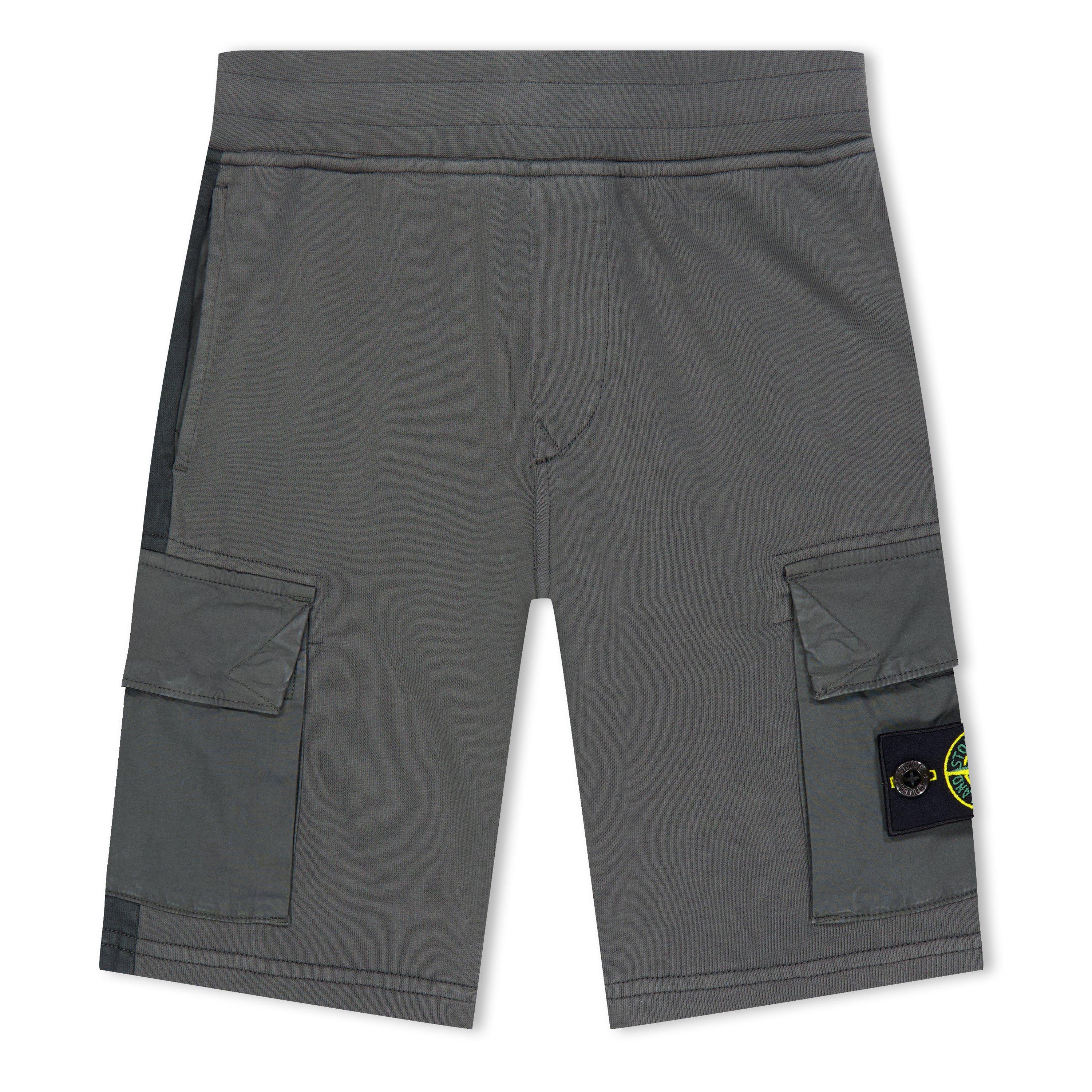 Bermuda shorts made of two cotton fleece materials, regular and mercerized, with cotton canvas appliqués. When garment dyed, the parts in mercerized fleece take the colour with a deeper and fuller shade. Front in regular cotton fleece, back in mercerized cotton fleece. On seam hand pockets. One cotton canvas bellows cargo pocket on each leg, with flap and hidden snaps fastening; the left pocket features the Stone Island badge. Elasticated waistband with inner drawstring.